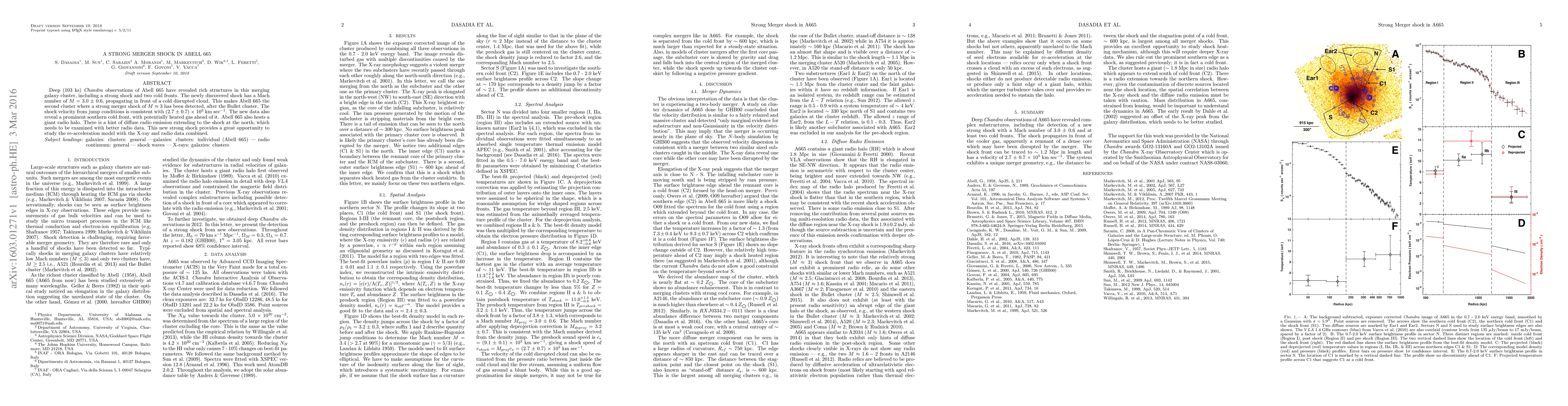 Deep Chandra observations of Abell 665 reveal a strong merger shock with a Mach number of 3.0 ± 0.6, alongside two cold fronts and a giant radio halo, offering insights into re-acceleration models. The shock's velocity aligns with (2.7 ± 0.7) × 10^3 km sec^-1, comparable to the Bullet cluster.