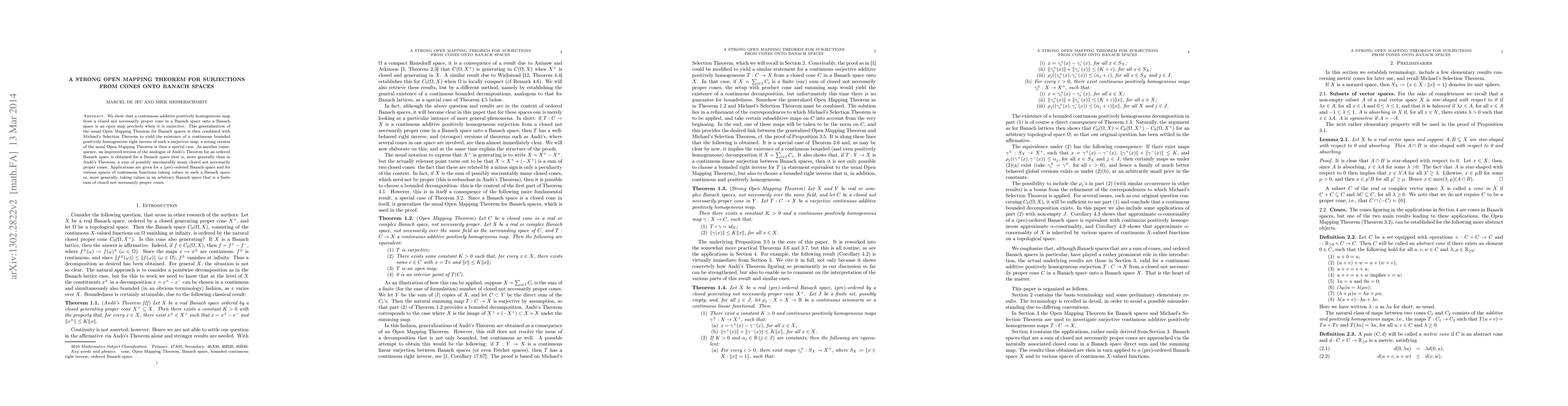 We show that a continuous additive positively homogeneous map from a closed not necessarily proper cone in a Banach space onto a Banach space is an open map precisely when it is surjective. This generalization of the usual Open Mapping Theorem for Banach spaces is then combined with Michael's Selection Theorem to yield the existence of a continuous bounded positively homogeneous right inverse of such a surjective map; a strong version of the usual Open Mapping Theorem is then a special case. As another consequence, an improved version of the analogue of And\^o's Theorem for an ordered Banach space is obtained for a Banach space that is, more generally than in And\^o's Theorem, a sum of possibly uncountably many closed not necessarily proper cones. Applications are given for a (pre)-ordered Banach space and for various spaces of continuous functions taking values in such a Banach space or, more generally, taking values in an arbitrary Banach space that is a finite sum of closed not necessarily proper cones.