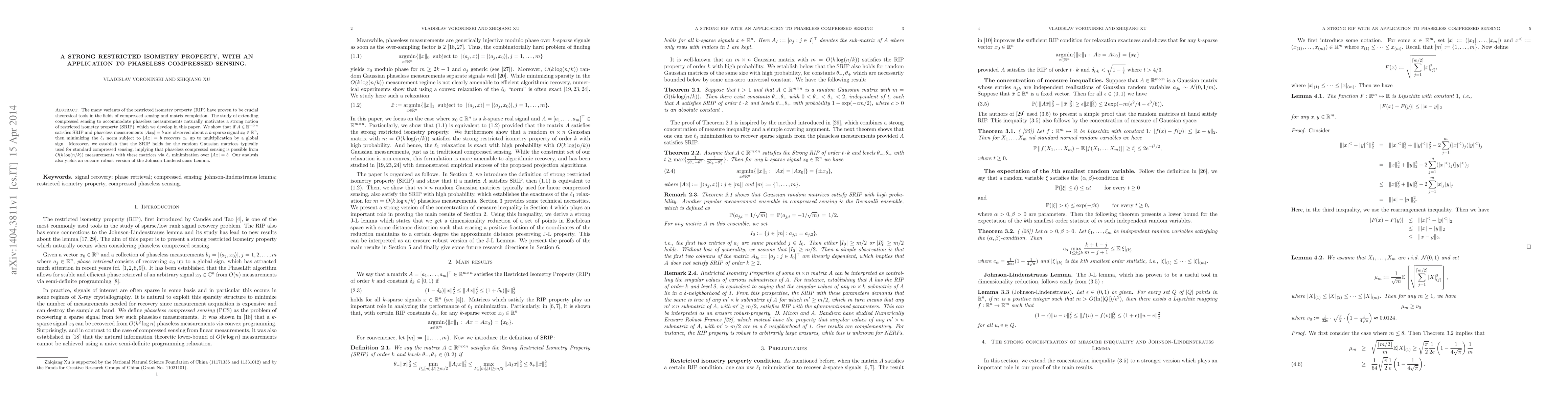 The work presents novel results on the restricted isometry property and phase retrieval, providing new insights into the fundamental limits of compressive sensing.
