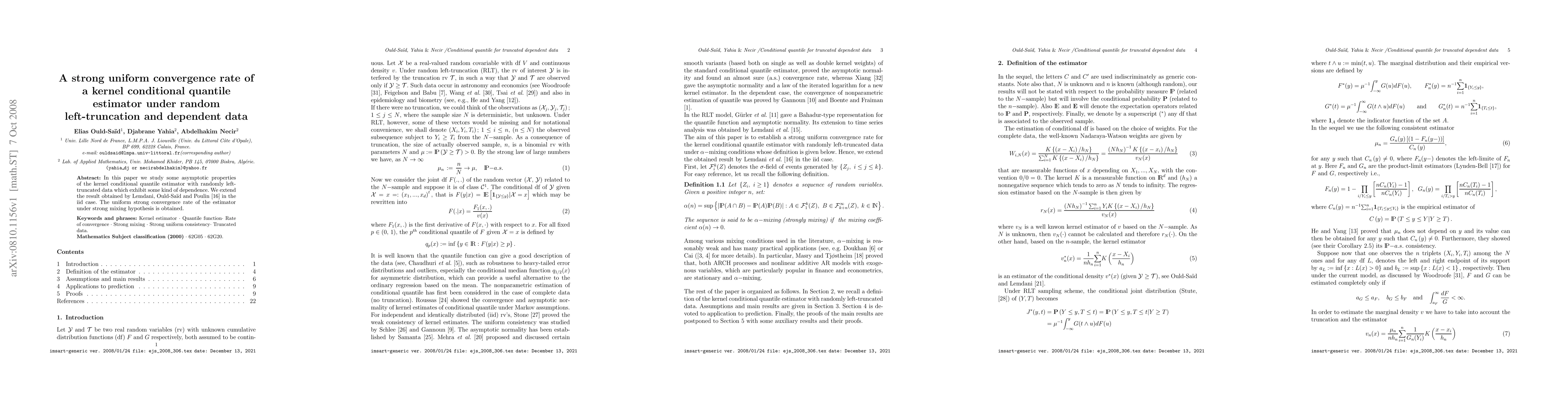 This paper investigates the asymptotic properties of a kernel conditional quantile estimator for randomly left-truncated data that exhibits dependence. It extends previous results for independent and identically distributed (iid) data, achieving a uniform strong convergence rate under a strong mixing hypothesis.
