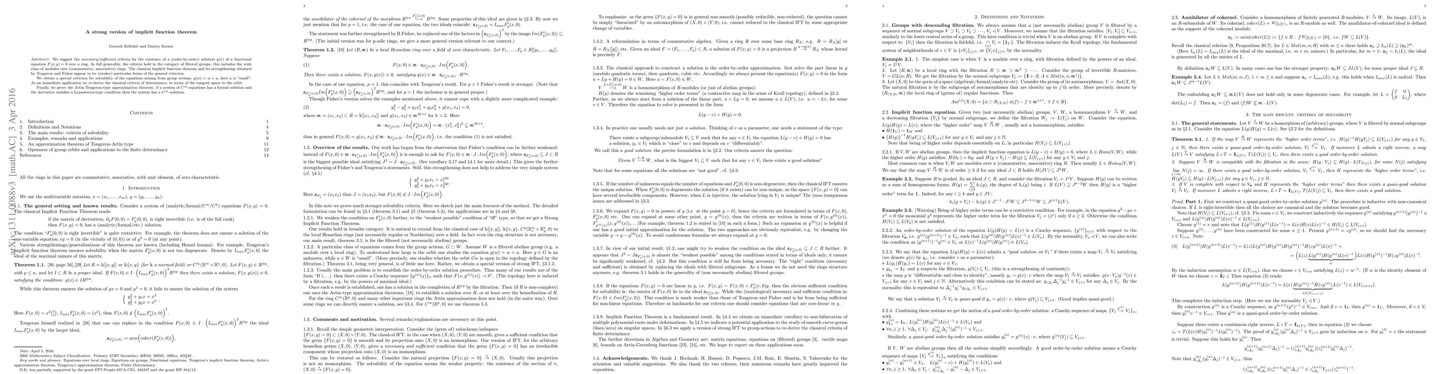 We suggest the necessary/sufficient criteria for the existence of a (order-by-order) solution y(x) of a functional equation F(x,y)=0 over a ring. In full generality, the criteria hold in the category of filtered groups, this includes the wide class of modules over (commutative, associative) rings. The classical implicit function theorem and its strengthening obtained by Tougeron and Fisher appear to be (weaker) particular forms of the general criterion. We obtain a special criterion for solvability of the equations arising from group actions, g(w)=w+u, here u is "small". As an immediate application we re-derive the classical criteria of determinacy, in terms of the tangent space to the orbit. Finally, we prove the Artin-Tougeron-type approximation theorem: if a system of C^\infty-equations has a formal solution and the derivative satisfies a Lojasiewicz-type condition then the system has a C^\infty-solution.