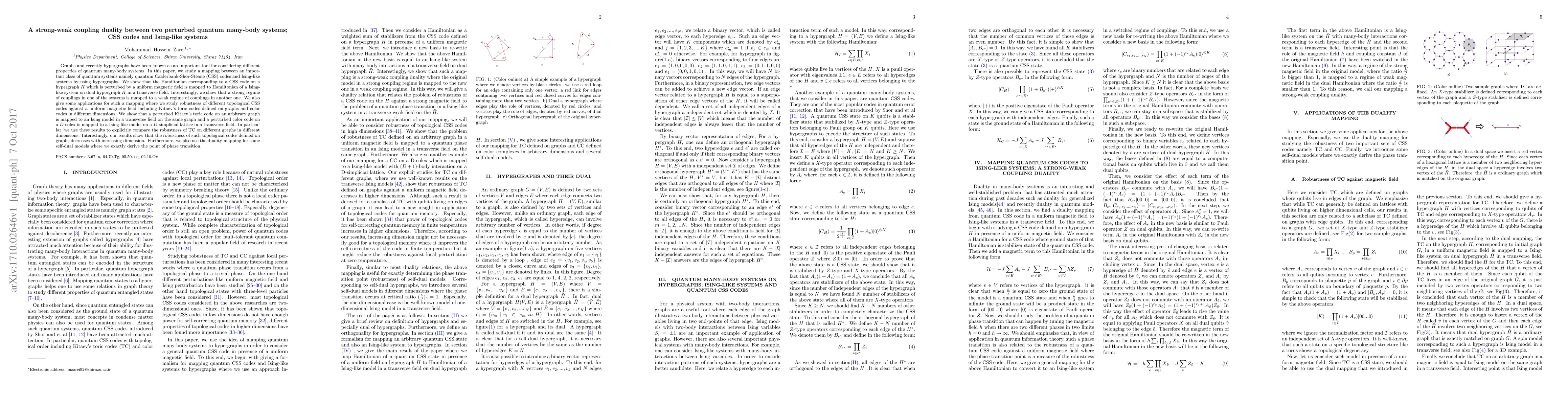 Graphs and recently hypergraphs have been known as an important tool for considering different properties of quantum many-body systems. In this paper, we study a mapping between an important class of quantum systems namely quantum Calderbank-Shor-Steane (CSS) codes and Ising-like systems by using hypergraphs. We show that the Hamiltonian corresponding to a CSS code on a hypergraph $H$ which is perturbed by a uniform magnetic field is mapped to Hamiltonian of a Ising-like system on dual hypergraph $\tilde{H}$ in a transverse field. Interestingly, we show that a strong regime of couplings in one of the systems is mapped to a weak regime of couplings in another one. We also give some applications for such a mapping where we study robustness of different topological CSS codes against a uniform magnetic field including Kitaev's toric codes defined on graphs and color codes in different dimensions. We show that a perturbed Kitaev's toric code on an arbitrary graph is mapped to an Ising model in a transverse field on the same graph and a perturbed color code on a D-colex is mapped to a Ising-like model on a D-simplicial lattice in a transverse field. In particular, we use these results to explicitly compare the robustness of TC on different graphs in different dimensions. Interestingly, our results show that the robustness of such topological codes defined on graphs decreases with increasing dimension. Furthermore, we also use the duality mapping for some self-dual models where we exactly derive the point of phase transition.