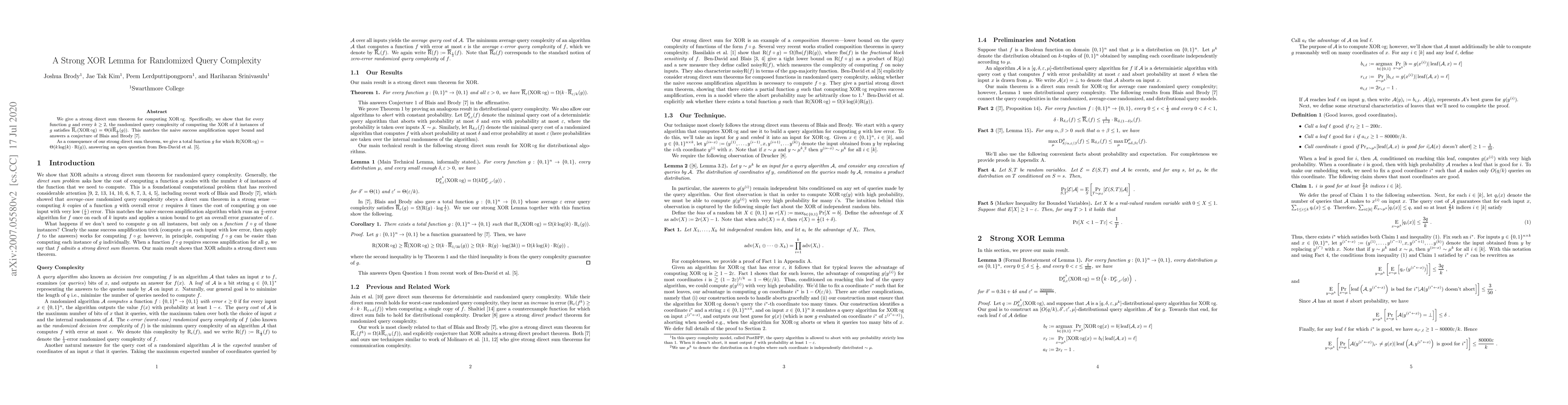 This paper establishes a strong direct sum theorem for randomized query complexity, proving that the randomized query complexity of computing the XOR of k instances of a function g is $\Theta(k \cdot \overline{R}_{\eps/k}(g))$, matching the upper bound and resolving a conjecture. It also provides a total function where the query complexity scales as $\Theta(k \log(k) \cdot R(g))$.