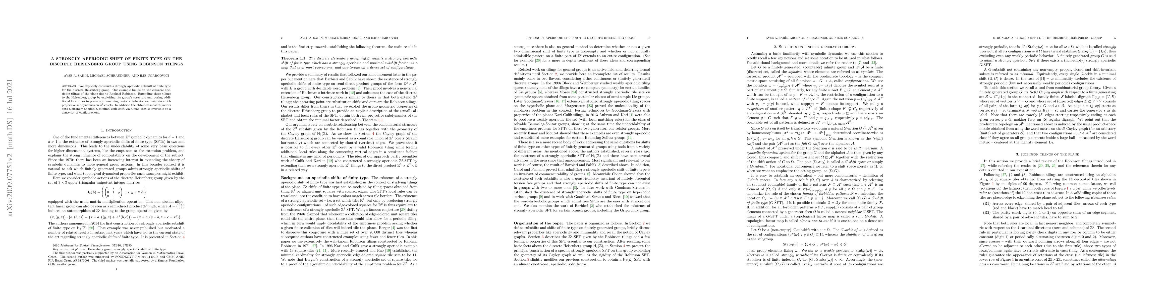 This paper presents a construction of a strongly aperiodic subshift of finite type for the discrete Heisenberg group, using extended versions of Robinson's classical aperiodic tilings. The method involves exploiting the group's structure, applying local rules, and preserving rich projective subdynamics on $mathbb Z^2$ cosets. The resulting subshift factors onto a minimal sofic shift via an invertible-on-dense map, ensuring strong aperiodicity.