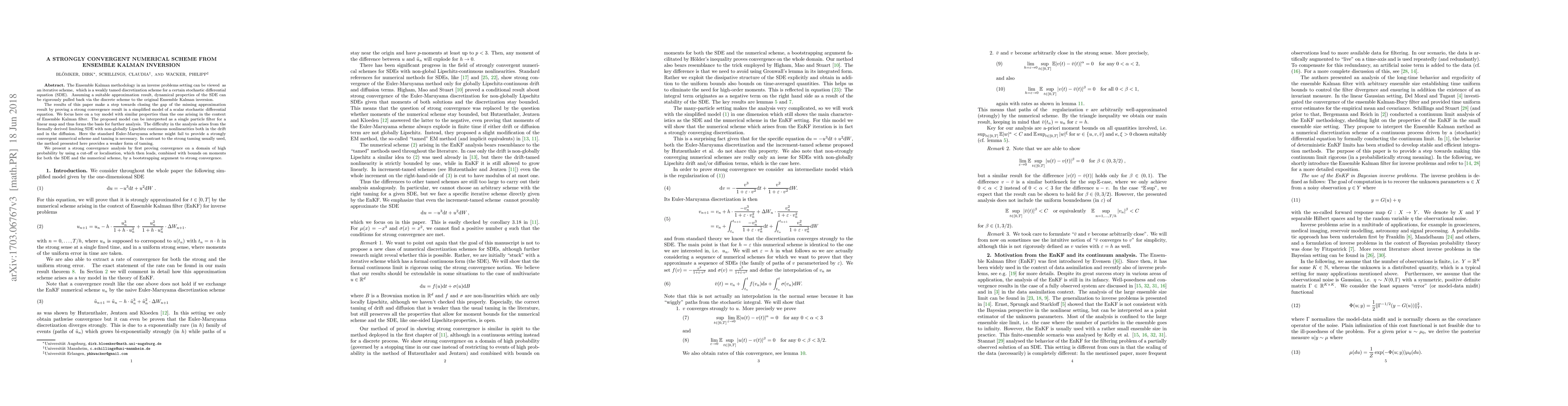 The Ensemble Kalman methodology in an inverse problems setting can be viewed as an iterative scheme, which is a weakly tamed discretization scheme for a certain stochastic differential equation (SDE). Assuming a suitable approximation result, dynamical properties of the SDE can be rigorously pulled back via the discrete scheme to the original Ensemble Kalman inversion. The results of this paper make a step towards closing the gap of the missing approximation result by proving a strong convergence result in a simplified model of a scalar stochastic differential equation. We focus here on a toy model with similar properties than the one arising in the context of Ensemble Kalman filter. The proposed model can be interpreted as a single particle filter for a linear map and thus forms the basis for further analysis. The difficulty in the analysis arises from the formally derived limiting SDE with non-globally Lipschitz continuous nonlinearities both in the drift and in the diffusion. Here the standard Euler-Maruyama scheme might fail to provide a strongly convergent numerical scheme and taming is necessary. In contrast to the strong taming usually used, the method presented here provides a weaker form of taming. We present a strong convergence analysis by first proving convergence on a domain of high probability by using a cut-off or localisation, which then leads, combined with bounds on moments for both the SDE and the numerical scheme, by a bootstrapping argument to strong convergence.