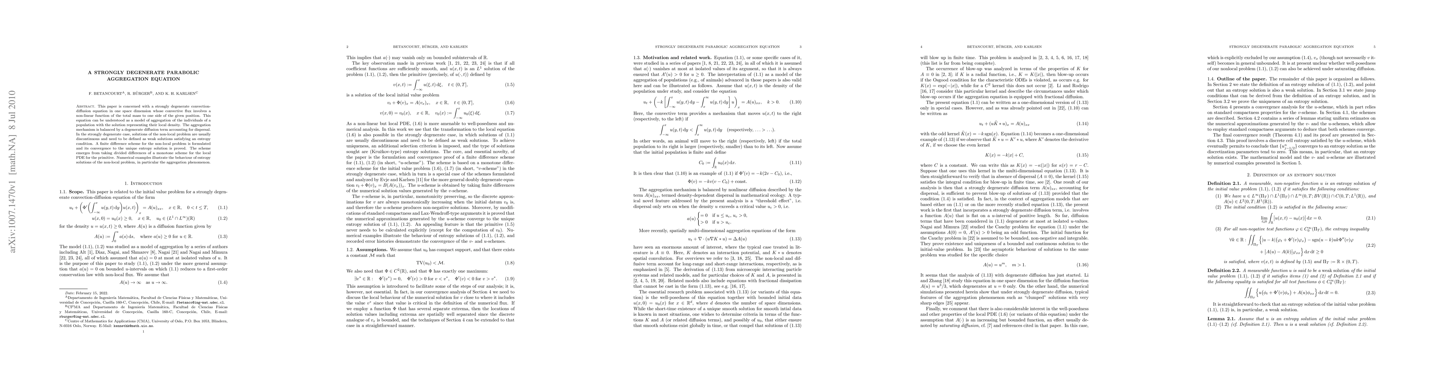 This paper studies a strongly degenerate convection-diffusion equation modeling population aggregation, where a non-linear convective flux balances a degenerate diffusion term. The authors propose a finite difference scheme and prove its convergence to the entropy solution, demonstrating the aggregation phenomenon through numerical examples.
