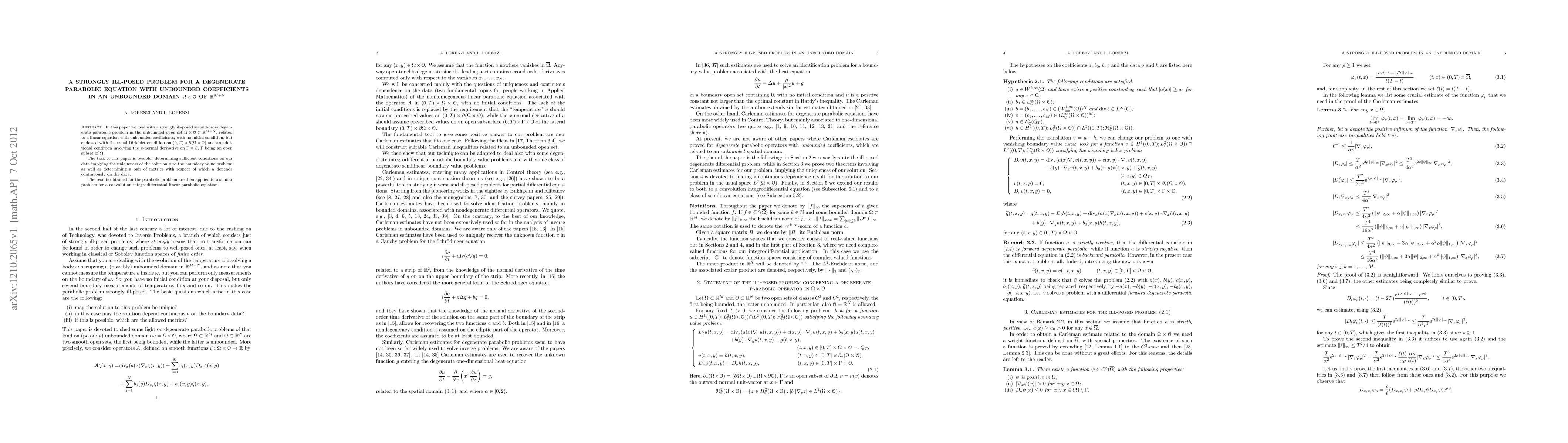 In this paper we deal with a strongly ill-posed second-order degenerate parabolic problem in the unbounded open set $\Omega\times {\mathcal O}\subset \mathbb R^{M+N}$, related to a linear equation with unbounded coefficients, with no initial condition, but endowed with the usual Dirichlet condition on $(0,T)\times \partial(\Omega\times {\mathcal O})$ and an additional condition involving the $x$-normal derivative on $\Gamma\times {\mathcal O}$, $\Gamma$ being an open subset of $\Omega$. The task of this paper is twofold: determining sufficient conditions on our data implying the uniqueness of the solution $u$ to the boundary value problem as well as determining a pair of metrics with respect of which $u$ depends continuously on the data. The results obtained for the parabolic problem are then applied to a similar problem for a convolution integrodifferential linear parabolic equation.