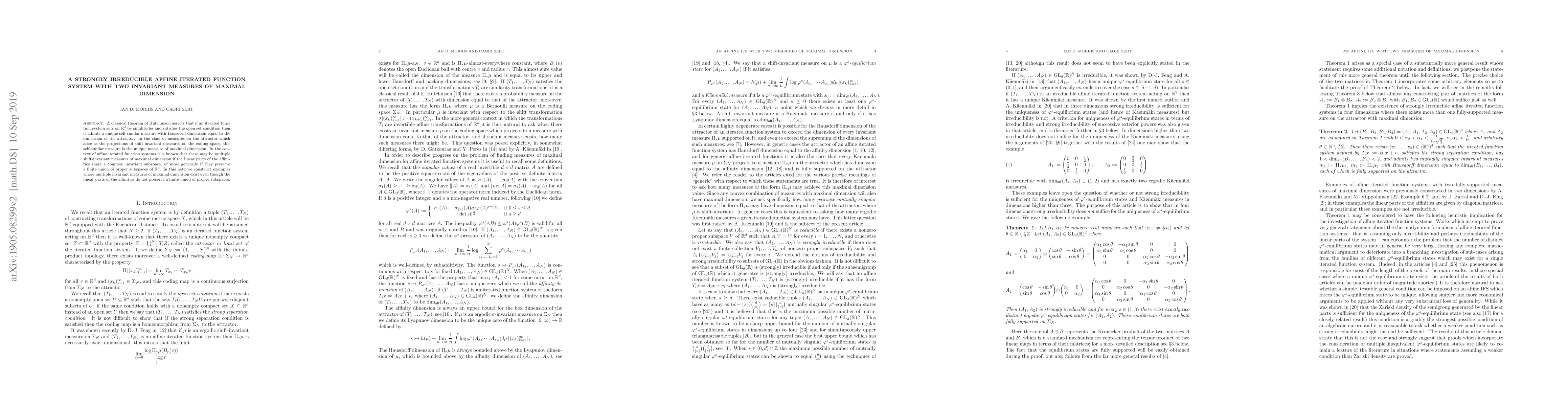 This paper constructs examples of strongly irreducible affine iterated function systems that possess two invariant measures of maximal dimension, despite the linear parts of the affinities not preserving a finite union of proper subspaces, challenging the classical uniqueness theorem of Hutchinson.