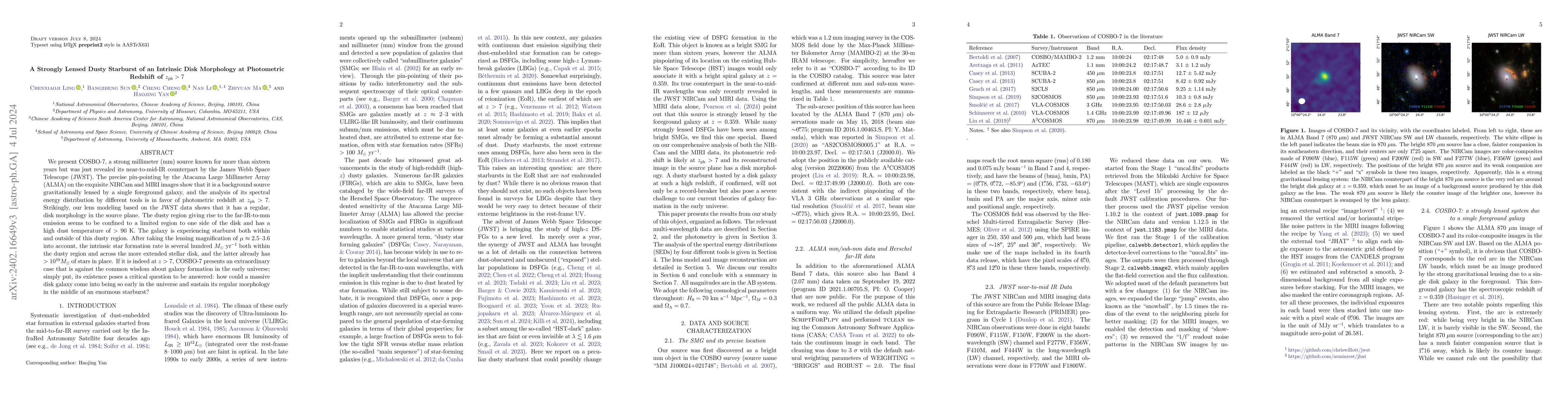 COSBO-7, a strongly lensed millimeter source at a photometric redshift of 7.7, reveals a regular disk morphology with intense starburst activity across its extended stellar disk, challenging existing galaxy formation theories. The galaxy's significant lensing magnification provides an unusually high star formation rate, posing questions about its early development and maintenance of structure amidst intense starburst conditions.