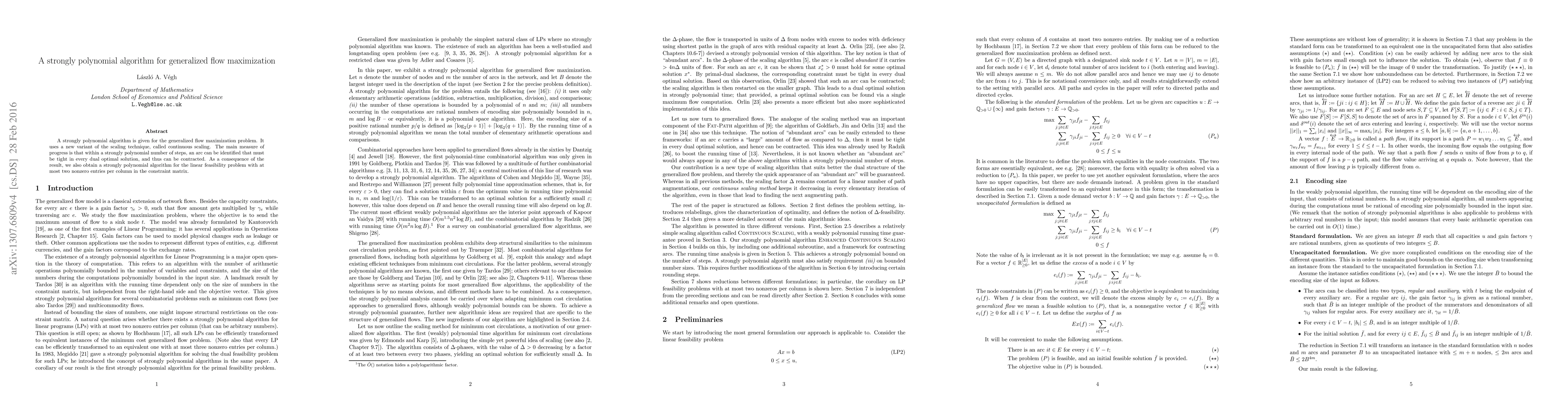 A strongly polynomial algorithm is given for the generalized flow maximization problem. It uses a new variant of the scaling technique, called continuous scaling. The main measure of progress is that within a strongly polynomial number of steps, an arc can be identified that must be tight in every dual optimal solution, and thus can be contracted. As a consequence of the result, we also obtain a strongly polynomial algorithm for the linear feasibility problem with at most two nonzero entries per column in the constraint matrix.