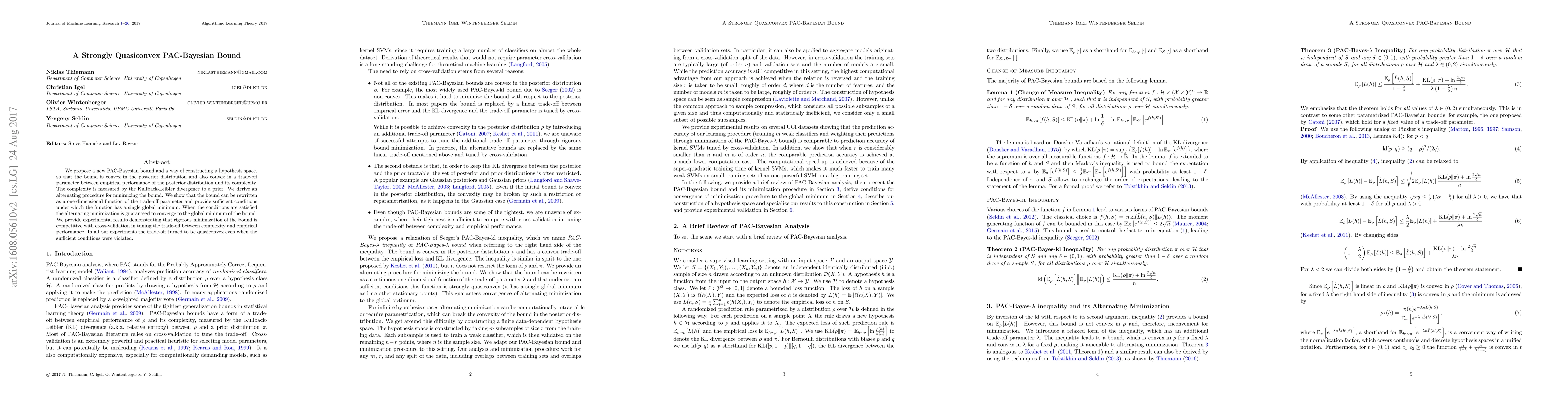 This paper introduces a novel PAC-Bayesian bound that is strongly quasiconvex, allowing for a convex trade-off between empirical performance and model complexity. The authors demonstrate an alternating minimization procedure that converges to the global minimum under certain conditions, and show experimental results indicating competitive performance compared to cross-validation.