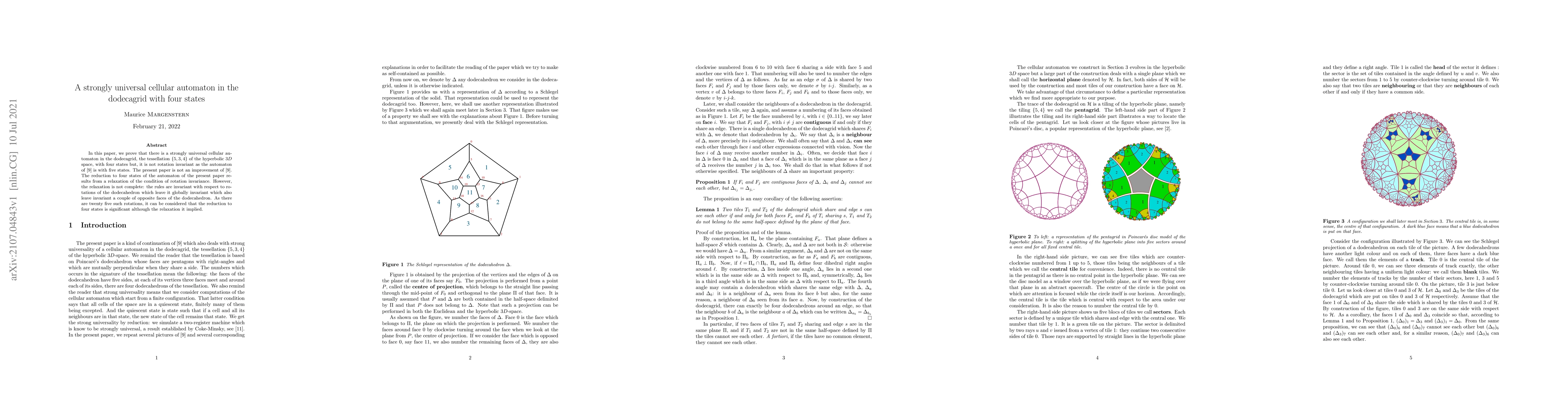 In this paper, we prove that there is a strongly universal cellular automaton in the dodecagrid, the tesselllation {5,3,4} of the hyperbolic 3D space, with four states but, it is not rotation invariant as the automaton of arXiv:2104.01561 is with five states. The present paper is not an improvement of arXiv:2104.01561. The reduction to four states of the automaton of the present paper results from a relaxation of the condition of rotation invariance. However, the relaxation is not complete: the rules are invariant with respect to rotations of the dodecahedron which leave it globally invariant which also leave invariant a couple of opposite faces of the dodecahedron. As there are twenty five such rotations, it can be considered that the reduction to four states is significant although the relaxation it implied.