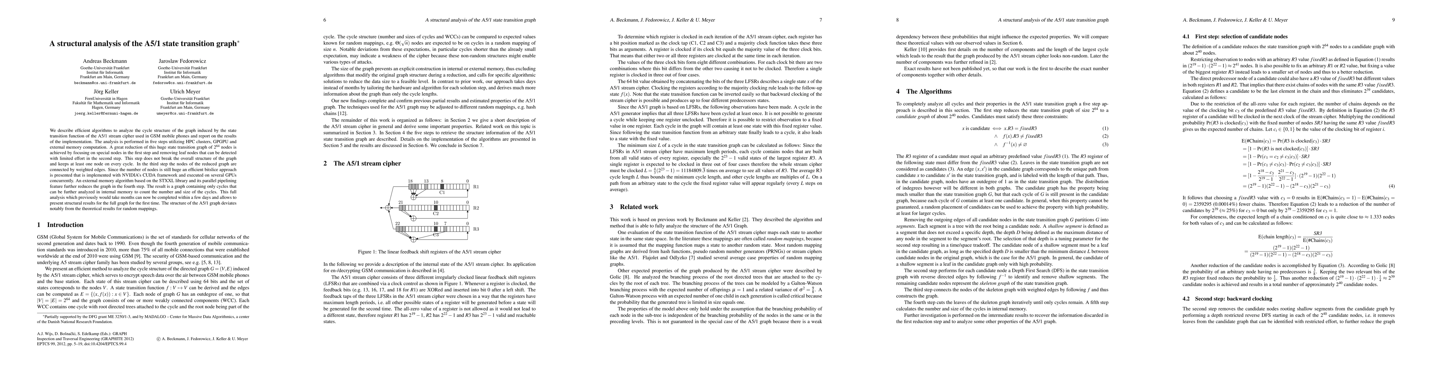 We describe efficient algorithms to analyze the cycle structure of the graph induced by the state transition function of the A5/1 stream cipher used in GSM mobile phones and report on the results of the implementation. The analysis is performed in five steps utilizing HPC clusters, GPGPU and external memory computation. A great reduction of this huge state transition graph of 2^64 nodes is achieved by focusing on special nodes in the first step and removing leaf nodes that can be detected with limited effort in the second step. This step does not break the overall structure of the graph and keeps at least one node on every cycle. In the third step the nodes of the reduced graph are connected by weighted edges. Since the number of nodes is still huge an efficient bitslice approach is presented that is implemented with NVIDIA's CUDA framework and executed on several GPUs concurrently. An external memory algorithm based on the STXXL library and its parallel pipelining feature further reduces the graph in the fourth step. The result is a graph containing only cycles that can be further analyzed in internal memory to count the number and size of the cycles. This full analysis which previously would take months can now be completed within a few days and allows to present structural results for the full graph for the first time. The structure of the A5/1 graph deviates notably from the theoretical results for random mappings.