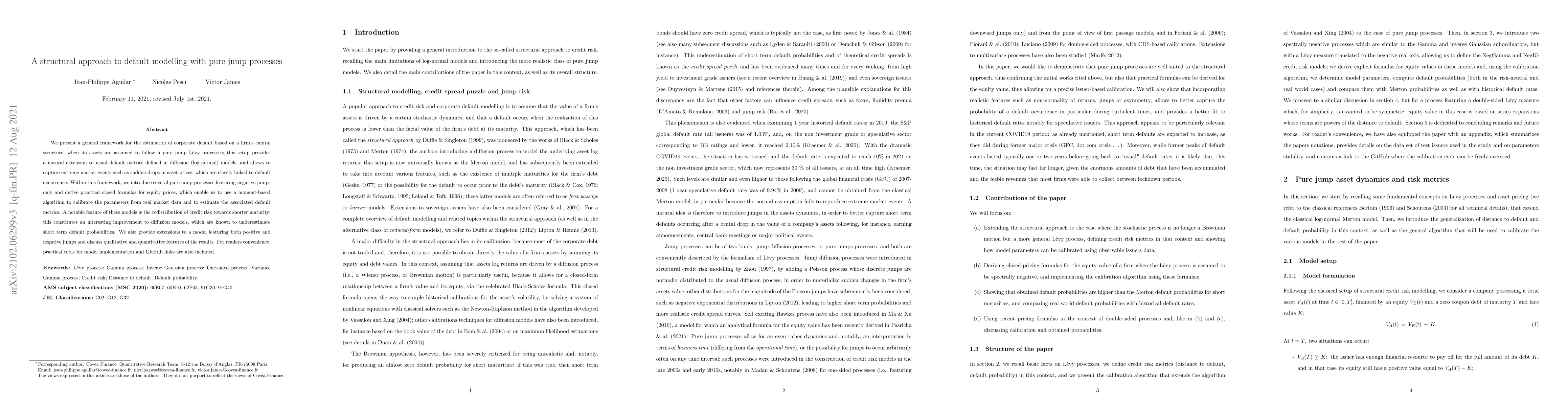 We present a general framework for the estimation of corporate default based on a firm's capital structure, when its assets are assumed to follow a pure jump L\'evy processes; this setup provides a natural extension to usual default metrics defined in diffusion (log-normal) models, and allows to capture extreme market events such as sudden drops in asset prices, which are closely linked to default occurrence. Within this framework, we introduce several pure jump processes featuring negative jumps only and derive practical closed formulas for equity prices, which enable us to use a moment-based algorithm to calibrate the parameters from real market data and to estimate the associated default metrics. A notable feature of these models is the redistribution of credit risk towards shorter maturity: this constitutes an interesting improvement to diffusion models, which are known to underestimate short term default probabilities. We also provide extensions to a model featuring both positive and negative jumps and discuss qualitative and quantitative features of the results. For readers convenience, practical tools for model implementation and GitHub links are also included.