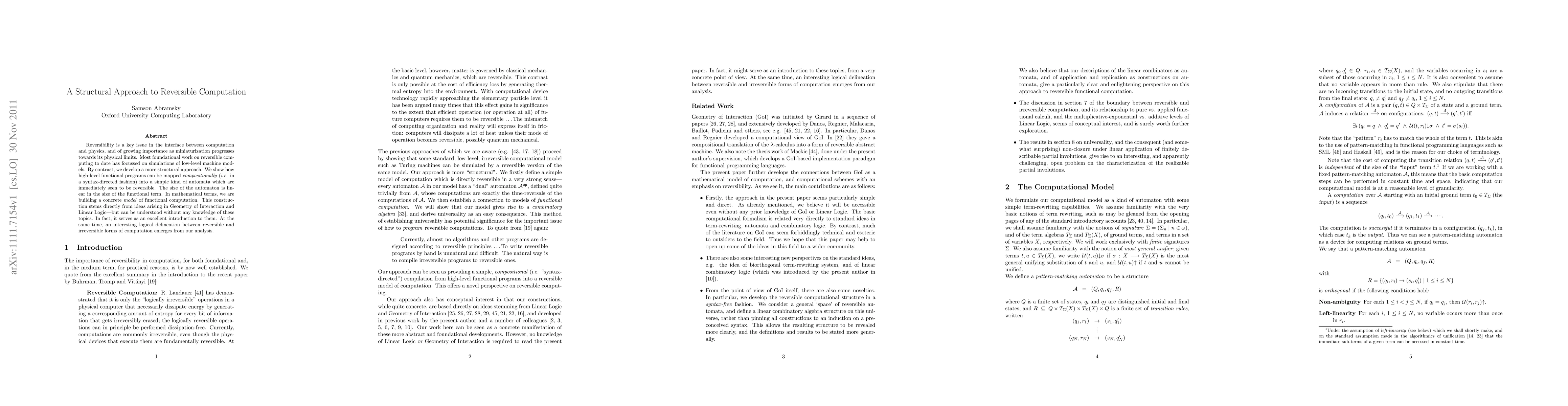 This paper proposes a structural approach to reversible computation, demonstrating how high-level functional programs can be mapped into reversible automata. It introduces a linear-size automaton model derived from Geometry of Interaction and Linear Logic, providing a clear distinction between reversible and irreversible computation.