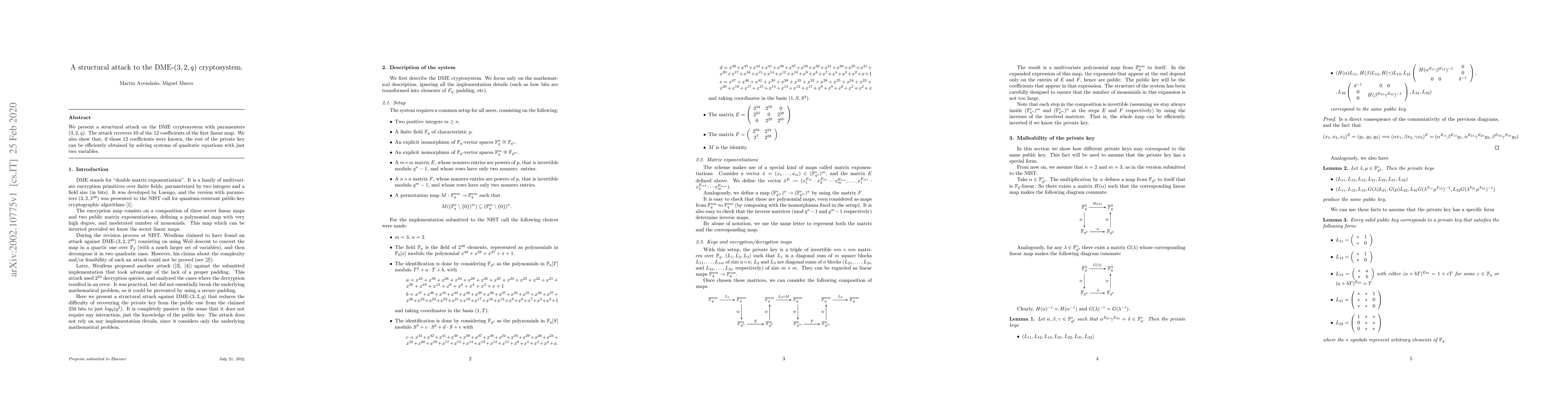 We present a structural attack on the DME cryptosystem with paramenters (3,2,q). The attack recovers 10 of the 12 coefficients of the first linear map. We also show that, if those 12 coefficients were known, the rest of the private key can be efficiently obtained by solving systems of quadratic equations with just two variables.