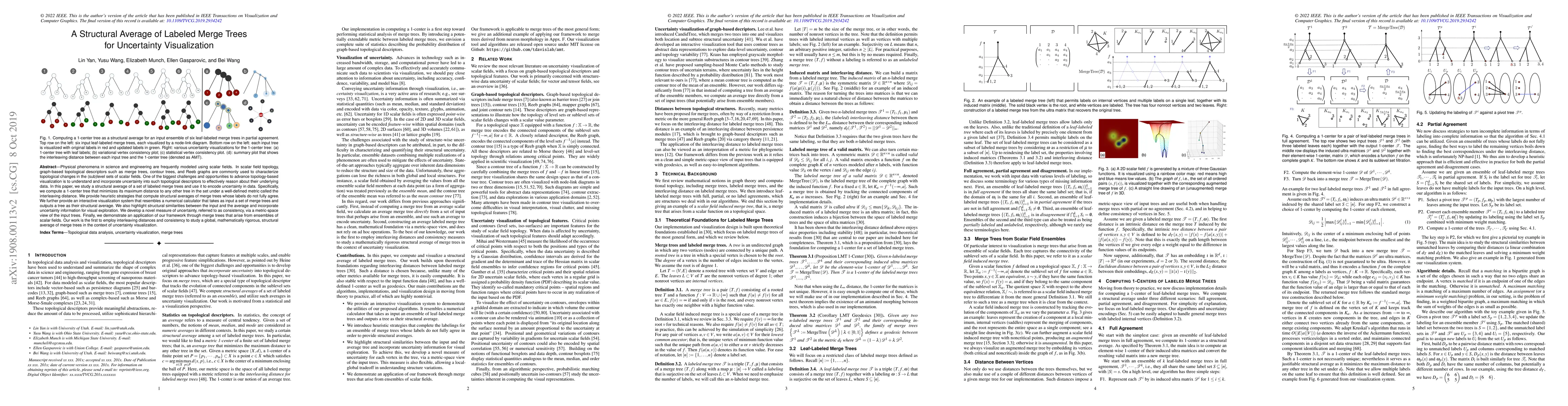 This paper proposes a method to compute a structural average of labeled merge trees to encode uncertainty in scalar field topology. It uses interleaving distances to minimize maximum distance to individual trees and provides heuristic strategies for averaging trees with differing labels, along with an interactive visualization system to explore structural similarities and uncertainty.