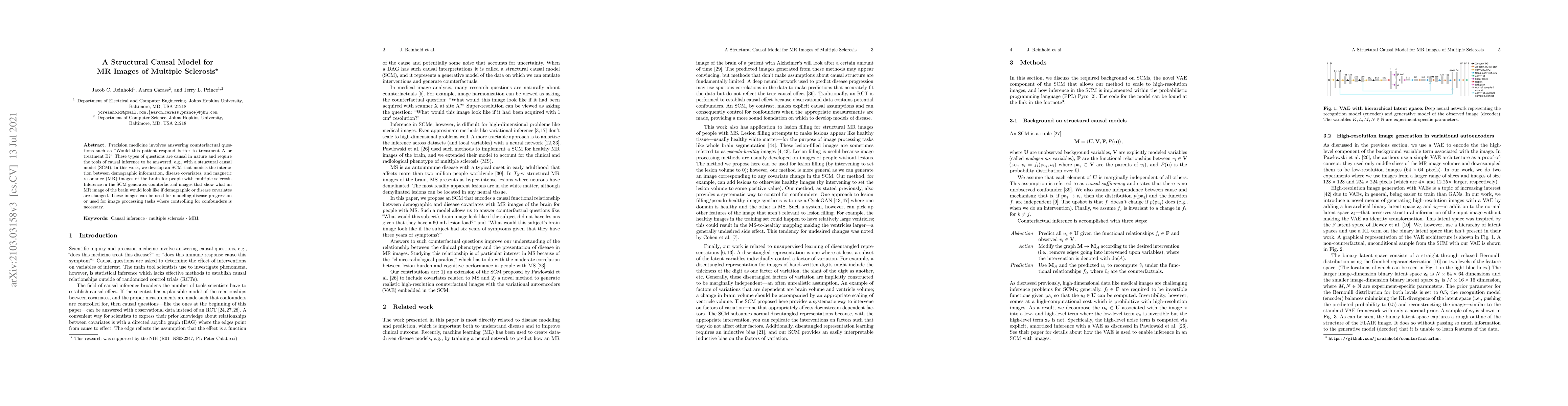 This paper develops a structural causal model (SCM) to analyze the interaction between demographic information, disease covariates, and MR images in multiple sclerosis patients. The SCM enables counterfactual predictions of MR images under different conditions, aiding in precision medicine and disease progression modeling.