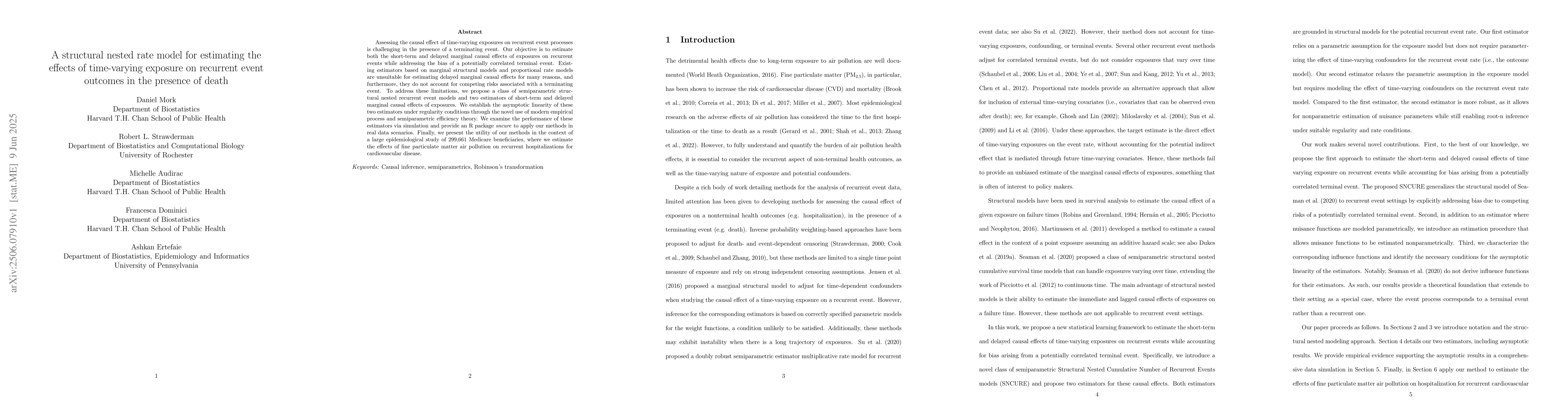 The paper proposes a new semiparametric structural nested recurrent event model to estimate short-term and delayed marginal causal effects of time-varying exposures on recurrent events, addressing biases from correlated terminal events and competing risks. It introduces estimators, proves their asymptotic linearity, and validates the method via simulations and a real-world cardiovascular disease study involving Medicare beneficiaries.