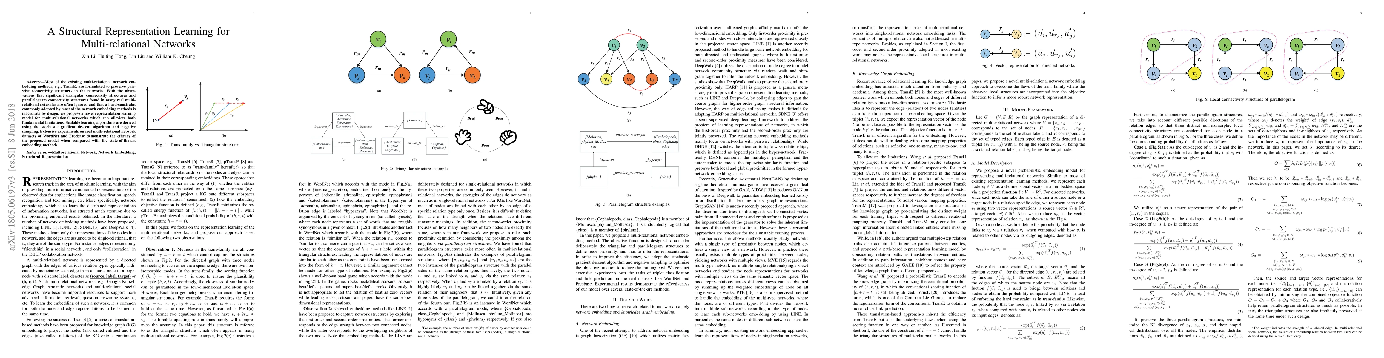 This paper proposes a novel representation learning model for multi-relational networks that addresses the limitations of existing methods by preserving triangular and parallelogram connectivity structures. The model employs scalable learning algorithms and outperforms state-of-the-art methods in experiments on WordNet and Freebase datasets.
