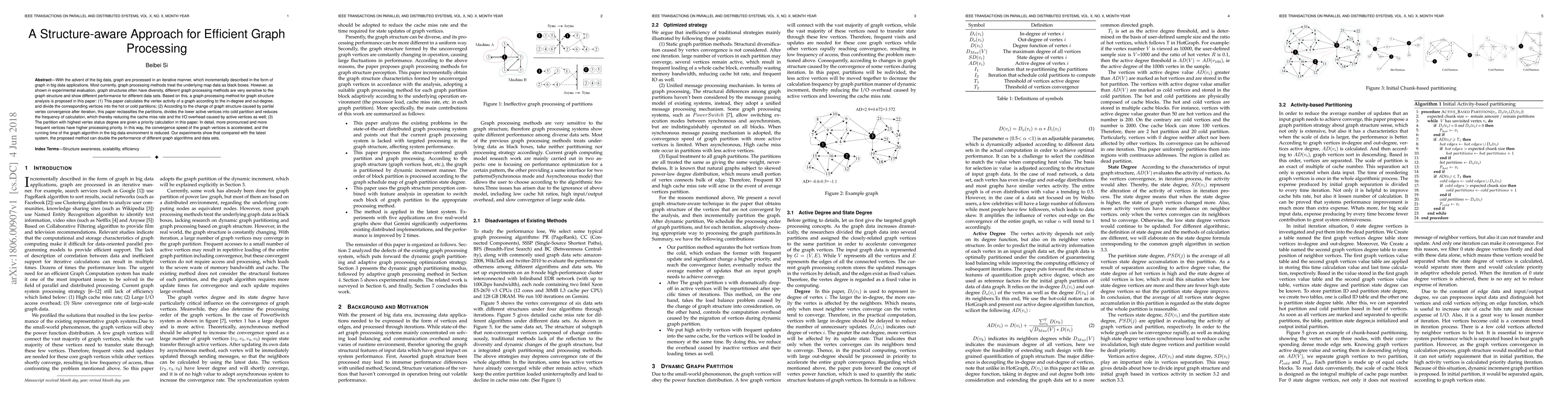With the advent of the big data, graph are processed in an iterative manner, which incrementally described in the form of graph in big data applications. Most currently, graph processing methods treat the underlying map data as black boxes. However, as shown in experimental evaluation, graph structures often have diversity, different graph processing methods are very sensitive to the graph structure and show different performance for different data sets. Based on this, a graph processing method for graph structure analysis is proposed in this paper: (1) This paper calculates the vertex activity of a graph according to the in-degree and out-degree, and divide the corresponding vertices into the hot or cold partitions; (2) According to the change of graph structure caused by partial vertex convergence after iteration, this paper reclassifies the partitions, divides the lower active vertices into cold partition and reduces the frequency of calculation, which thereby reducing the cache miss rate and the I/O overhead caused by active vertices as well; (3) The partition with highest vertex status degree are given a priority calculation in this paper. In detail, more pronounced and more frequent vertices have higher processing priority. In this way, the convergence speed of the graph vertices is accelerated, and the running time of the graph algorithm in the big data environment is reduced. Our experiments show that compared with the latest system, the proposed method can double the performance of different graph algorithms and data sets.