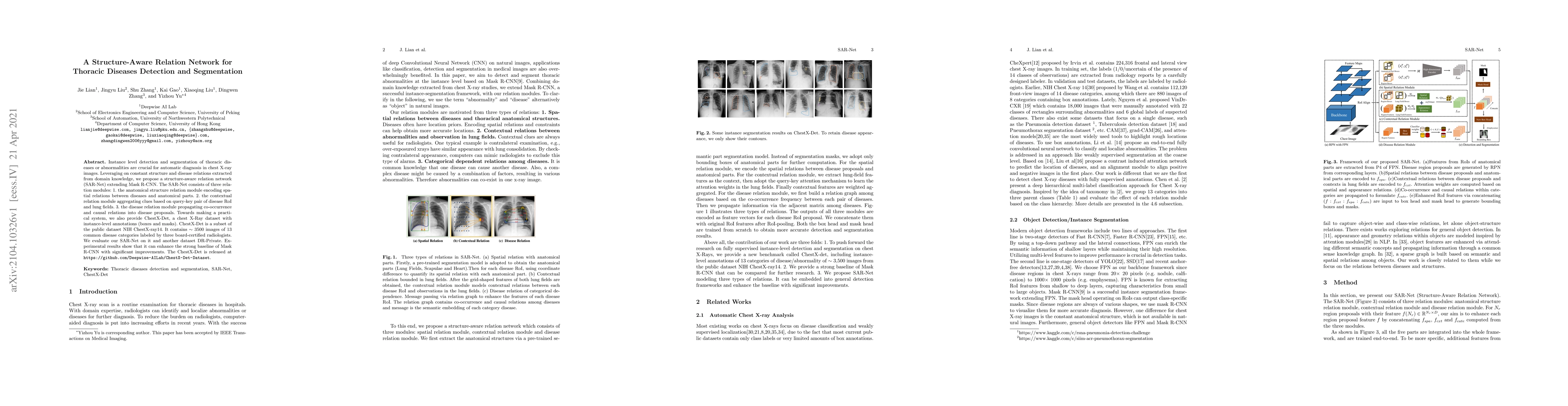 This research introduces a structure-aware relation network (SAR-Net) to improve the detection and segmentation of thoracic diseases in chest X-ray images. The SAR-Net extends Mask R-CNN with three relation modules to encode spatial, contextual, and disease relations, enhancing diagnostic accuracy. The authors also release ChestX-Det, a dataset with instance-level annotations, to facilitate further research in this area. For more details, please refer to the original paper.