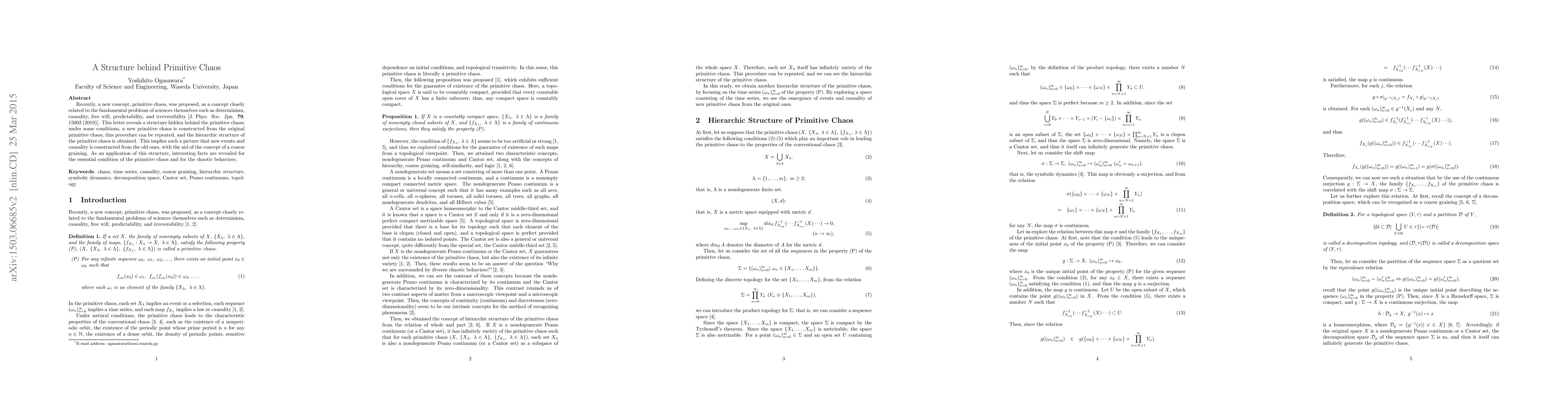 Recently, a new concept, primitive chaos, was proposed, as a concept closely related to the fundamental problems of physics itself such as determinism, causality, free will, predictability, and irreversibility [J. Phys. Soc. Jpn. {\bf 79}, 15002 (2010)]. This letter reveals a structure hidden behind the primitive chaos; under some conditions, a new primitive chaos is constructed from the original primitive chaos, this procedure can be repeated, and the hierarchic structure of the primitive chaos is obtained. This implies such a picture that new events and causality is constructed from the old ones, with the aid of the concept of a coarse graining. As an application of this structure, interesting facts are revealed for the essential condition of the primitive chaos and for the chaotic behaviors.