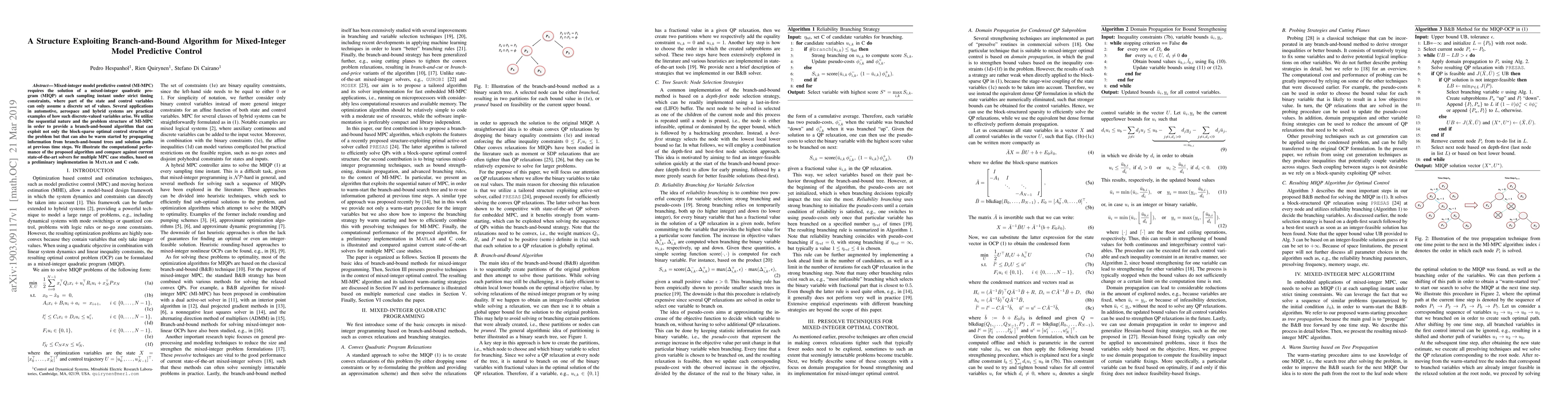 Mixed-integer model predictive control (MI-MPC) requires the solution of a mixed-integer quadratic program (MIQP) at each sampling instant under strict timing constraints, where part of the state and control variables can only assume a discrete set of values. Several applications in automotive, aerospace and hybrid systems are practical examples of how such discrete-valued variables arise. We utilize the sequential nature and the problem structure of MI-MPC in order to provide a branch-and-bound algorithm that can exploit not only the block-sparse optimal control structure of the problem but that can also be warm started by propagating information from branch-and-bound trees and solution paths at previous time steps. We illustrate the computational performance of the proposed algorithm and compare against current state-of-the-art solvers for multiple MPC case studies, based on a preliminary implementation in MATLAB and C code.
