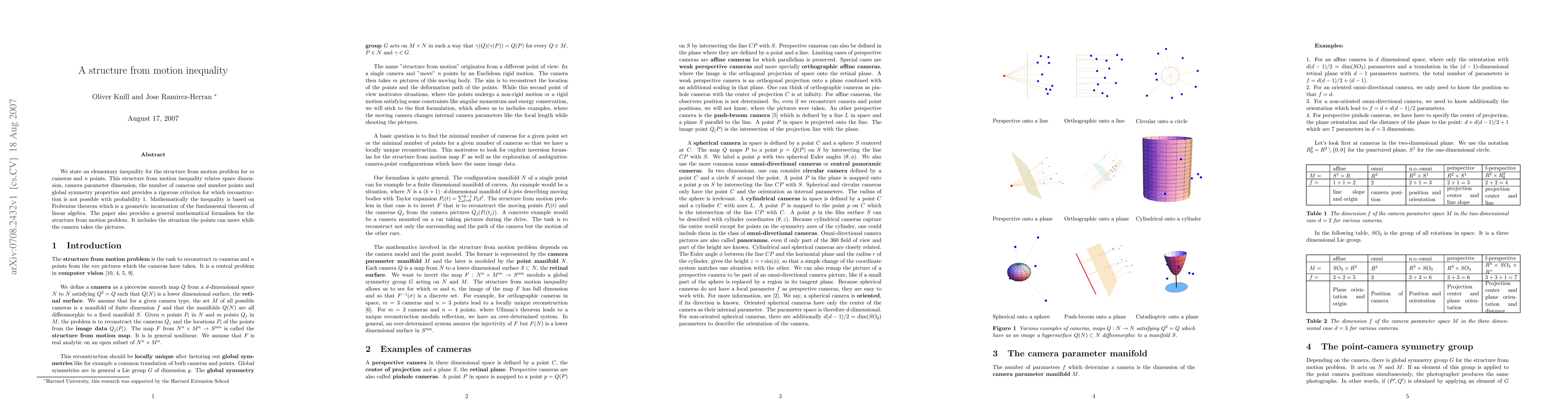 We state an elementary inequality for the structure from motion problem for m cameras and n points. This structure from motion inequality relates space dimension, camera parameter dimension, the number of cameras and number points and global symmetry properties and provides a rigorous criterion for which reconstruction is not possible with probability 1. Mathematically the inequality is based on Frobenius theorem which is a geometric incarnation of the fundamental theorem of linear algebra. The paper also provides a general mathematical formalism for the structure from motion problem. It includes the situation the points can move while the camera takes the pictures.