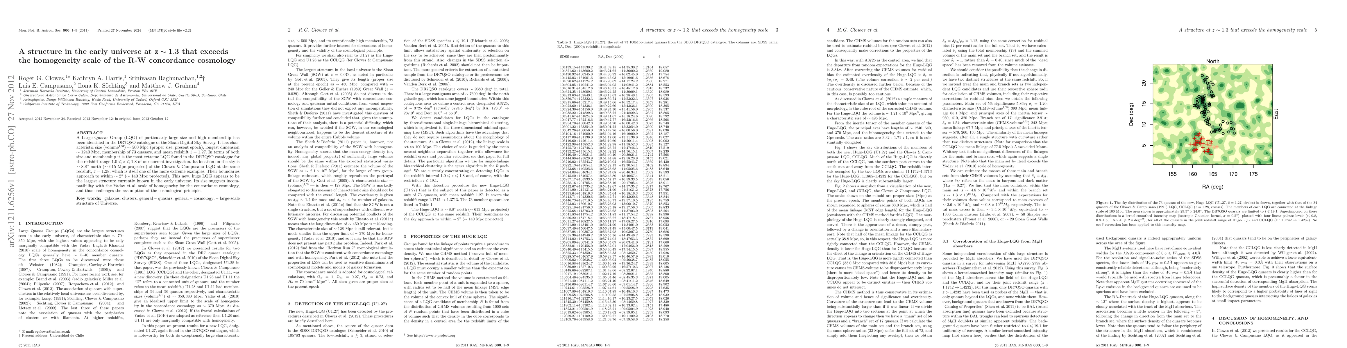 This paper identifies a remarkably large and dense Large Quasar Group (LQG) in the early universe at redshift ~1.3, with a proper size of ~1240 Mpc and 73 quasars, challenging the homogeneity scale of the R-W concordance cosmology and questioning the cosmological principle.