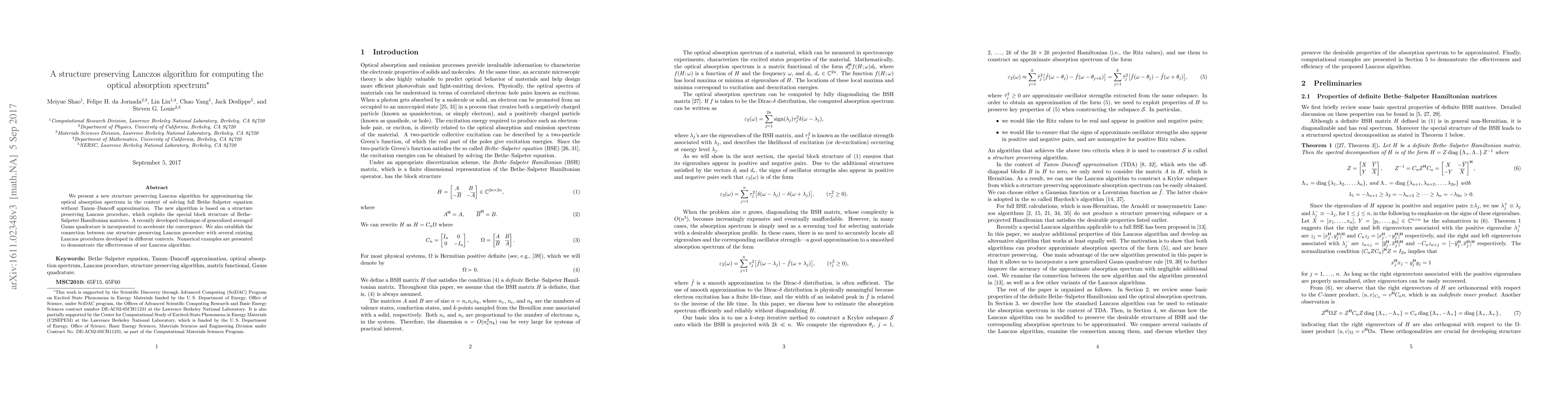 This paper introduces a novel structure preserving Lanczos algorithm for approximating the optical absorption spectrum by solving the full Bethe-Salpeter equation. It leverages the special block structure of Hamiltonian matrices and incorporates generalized averaged Gauss quadrature to enhance convergence, demonstrating its effectiveness through numerical examples.