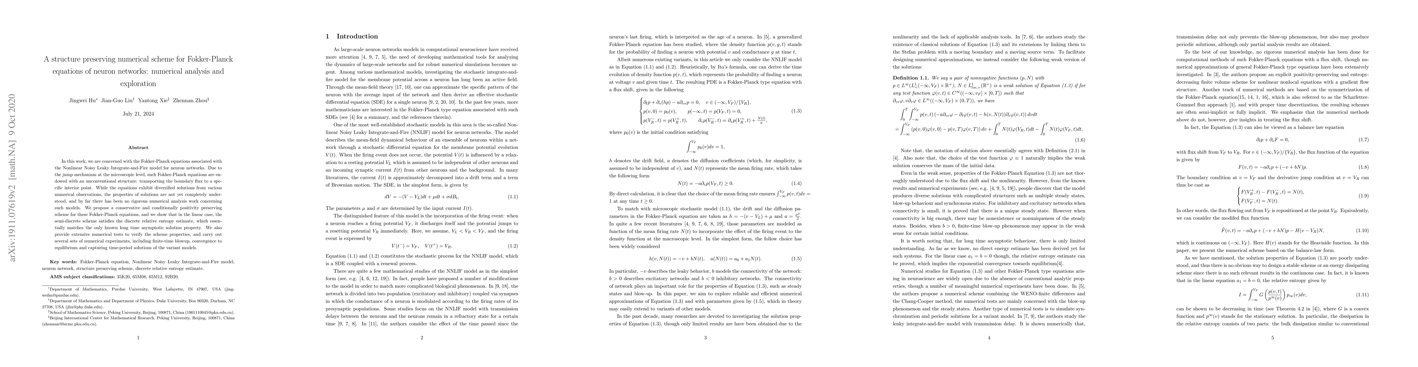 This paper proposes a conservative numerical scheme for Fokker-Planck equations linked to neuron networks, ensuring positivity and relative entropy preservation. The scheme is validated through numerical tests and experiments demonstrating its ability to capture diverse solution behaviors.