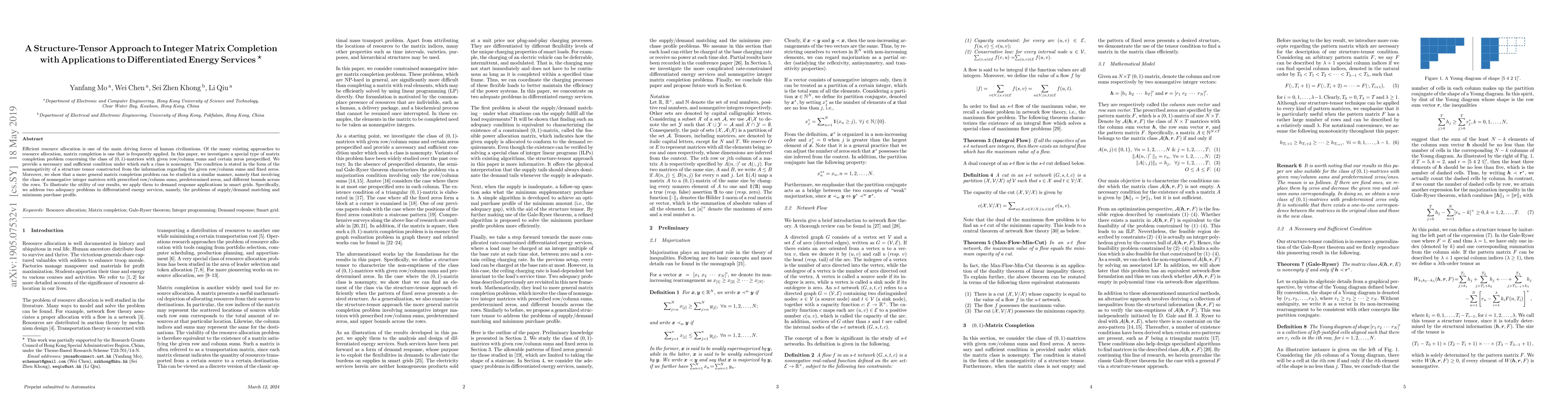 Efficient resource allocation is one of the main driving forces of human civilizations. Of the many existing approaches to resource allocation, matrix completion is one that is frequently applied. In this paper, we investigate a special type of matrix completion problem concerning the class of $(0,1)$-matrices with given row/column sums and certain zeros prespecified. We provide a necessary and sufficient condition under which such a class is nonempty. The condition is stated in the form of the nonnegativity of a structure tensor constructed from the information regarding the given row/column sums and fixed zeros. Moreover, we show that a more general matrix completion problem can be studied in a similar manner, namely that involving the class of nonnegative integer matrices with prescribed row/column sums, predetermined zeros, and different bounds across the rows. To illustrate the utility of our results, we apply them to demand response applications in smart grids. Specifically, we address two adequacy problems in differentiated energy services, namely, the problems of supply/demand matching and minimum purchase profile.