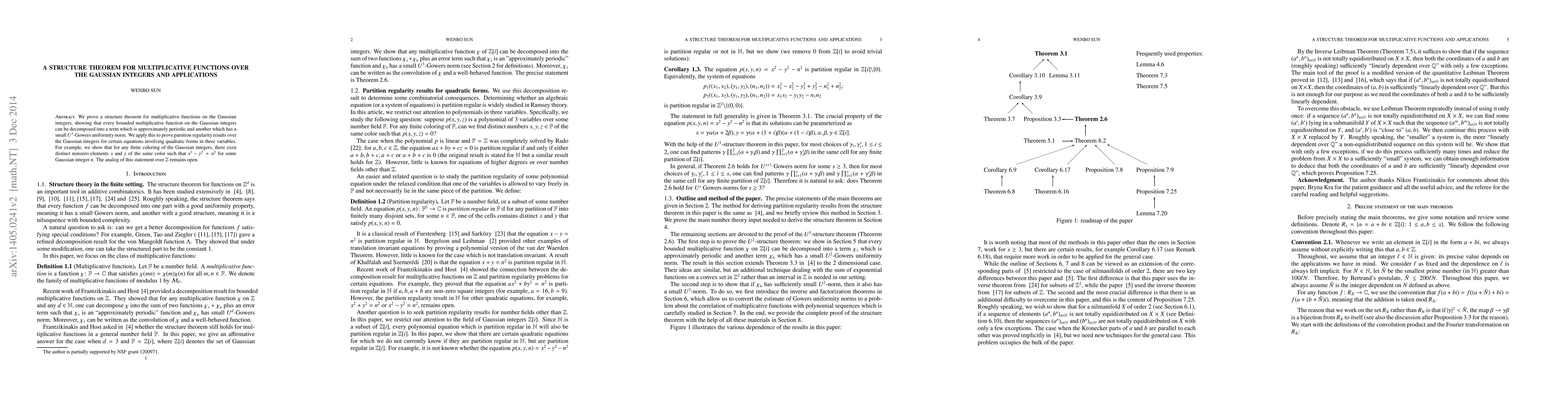 This paper proves a structure theorem for multiplicative functions on the Gaussian integers, showing their decomposition into an approximately periodic term and a term with small Gowers uniformity norm. The theorem is applied to establish partition regularity results for certain quadratic form equations in three variables over the Gaussian integers.