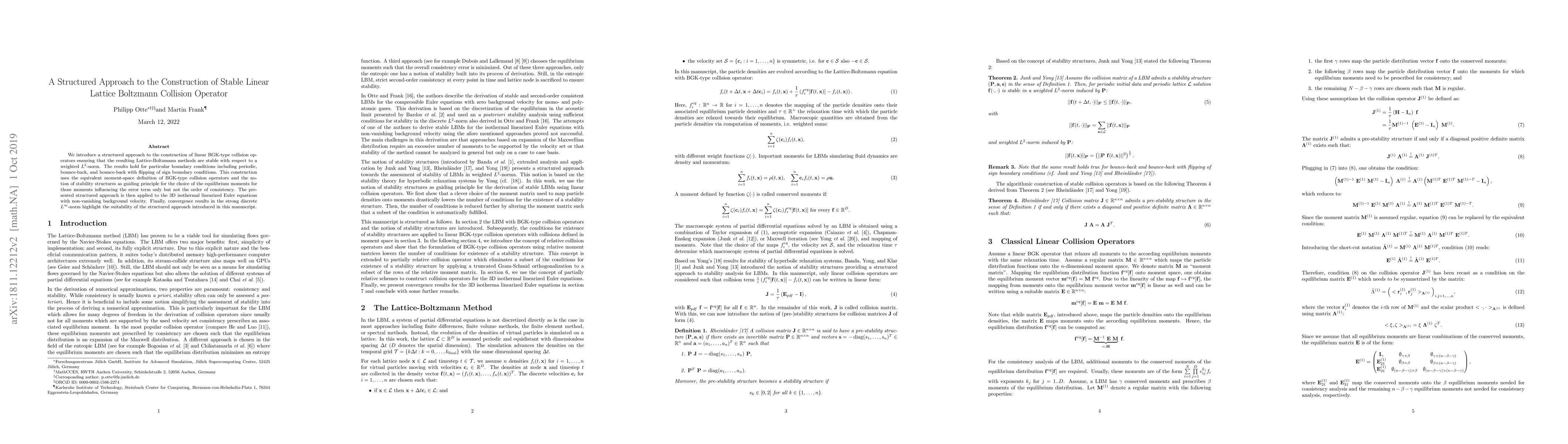 We introduce a structured approach to the construction of linear BGK-type collision operators ensuring that the resulting Lattice-Boltzmann methods are stable with respect to a weighted $L^2$-norm. The results hold for particular boundary conditions including periodic, bounce-back, and bounce-back with flipping of sign. This construction uses the equivalent moment-space definition of BGK-type collision operators and the notion of stability structures as guiding principle for the choice of the equilibrium moments for those moments influencing the error term only but not the order of consistency. The presented structured approach is then applied to the 3D isothermal linearized Euler equations with non-vanishing background velocity. Finally, convergence results in the strong discrete $L^\infty$-norm highlight the suitability of the structured approach introduced in this manuscript.