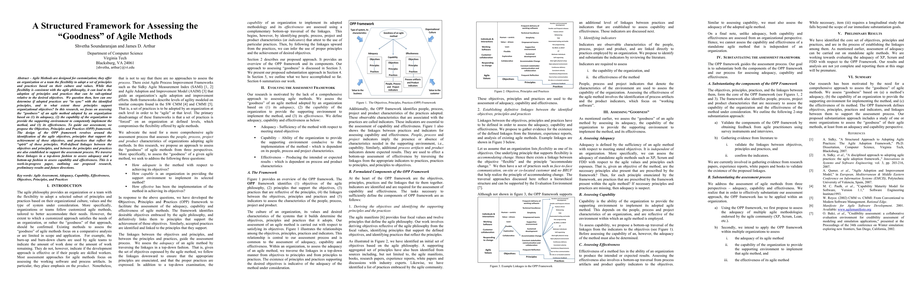 Agile Methods are designed for customization; they offer an organization or a team the flexibility to adopt a set of principles and practices based on their culture and values. While that flexibility is consistent with the agile philosophy, it can lead to the adoption of principles and practices that can be sub-optimal relative to the desired objectives. We question then, how can one determine if adopted practices are "in sync" with the identified principles, and to what extent those principles support organizational objectives? In this research, we focus on assessing the "goodness" of an agile method adopted by an organization based on (1) its adequacy, (2) the capability of the organization to provide the supporting environment to competently implement the method, and (3) its effectiveness. To guide our assessment, we propose the Objectives, Principles and Practices (OPP) framework. The design of the OPP framework revolves around the identification of the agile objectives, principles that support the achievement of those objectives, and practices that reflect the "spirit" of those principles. Well-defined linkages between the objectives and principles, and between the principles and practices are also established to support the assessment process. We traverse these linkages in a top-down fashion to assess adequacy and a bottom-up fashion to assess capability and effectiveness. This is a work-in-progress paper, outlining our proposed research, preliminary results and future directions.