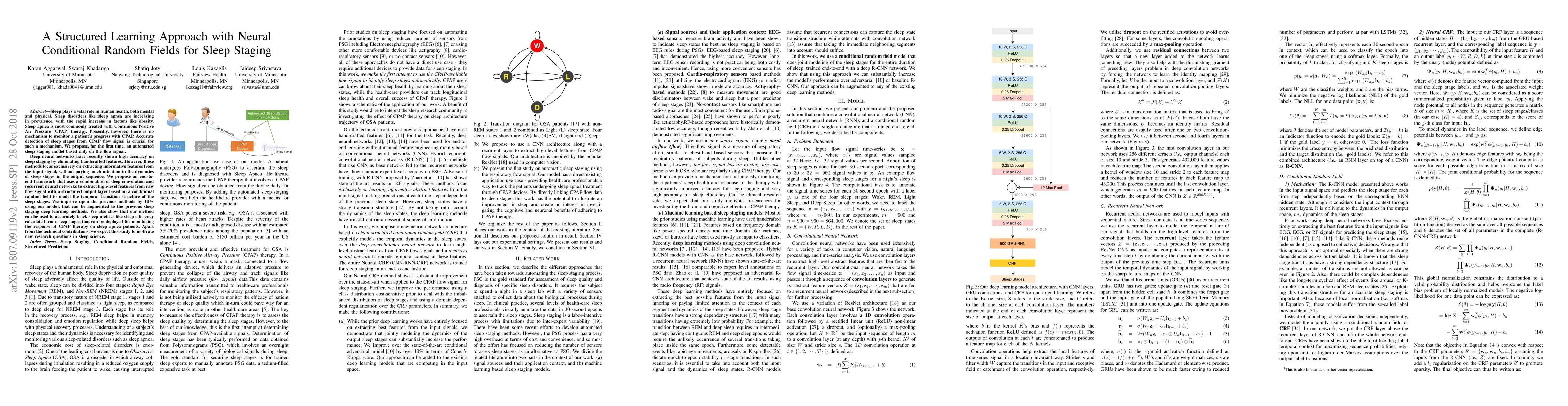 This paper proposes a new approach to automated sleep staging from CPAP flow signals using deep convolutional and recurrent neural networks and conditional random fields, achieving an accuracy improvement of 10% over previous methods.