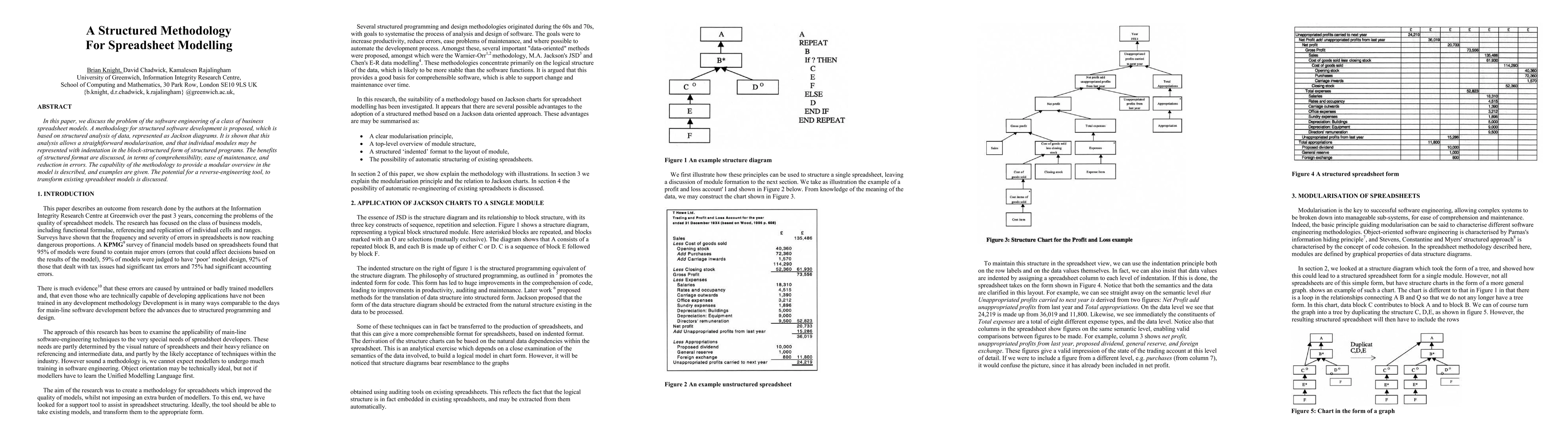 This paper proposes a structured methodology for developing business spreadsheet models based on structured analysis and Jackson diagrams, emphasizing modularization, comprehensibility, and error reduction. It also explores the potential for reverse-engineering tools to transform existing spreadsheet models.