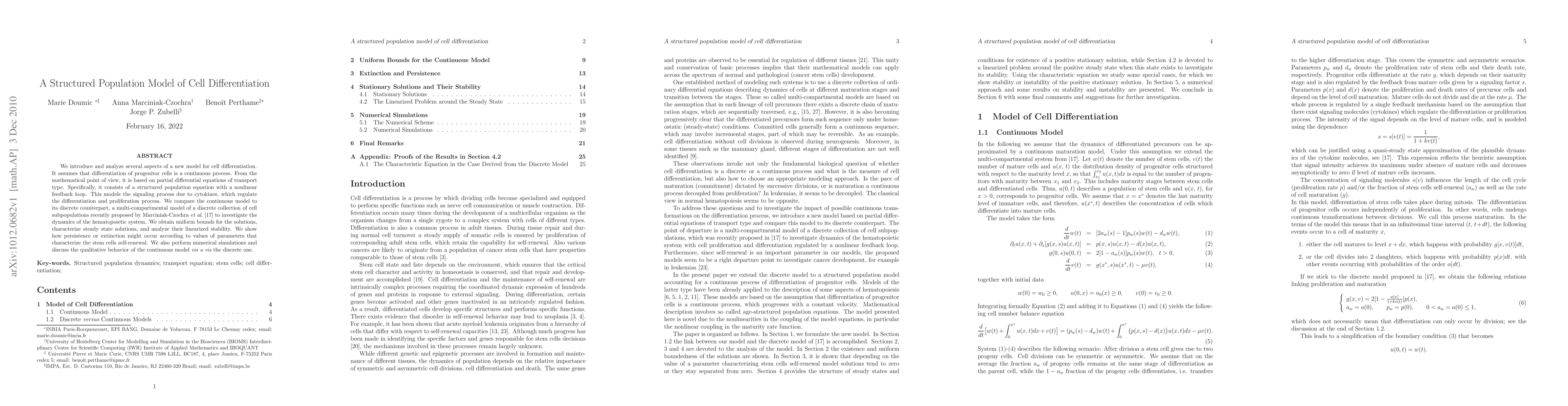 This paper develops a structured population model based on partial differential equations to describe the continuous differentiation process of progenitor cells, incorporating cytokine signaling feedback. It compares the continuous model to a discrete multi-compartmental model, analyzes stability and persistence conditions, and performs numerical simulations to explore the dynamics of cell differentiation.