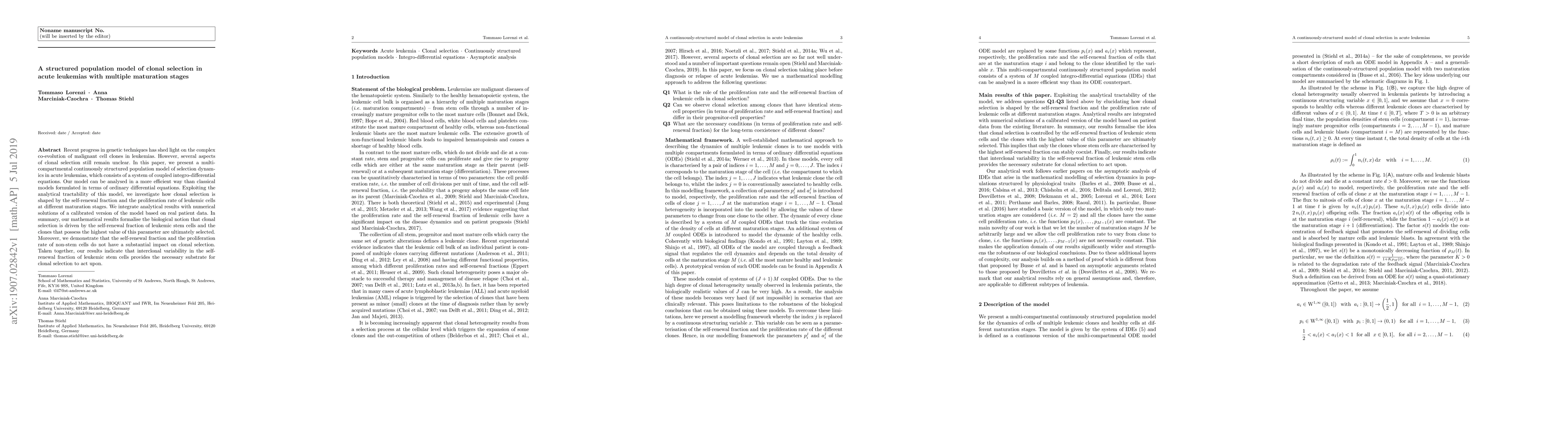 This paper presents a structured population model to analyze clonal selection dynamics in acute leukemias using integro-differential equations. The model reveals that clonal selection is primarily driven by the self-renewal fraction of leukemic stem cells, with minimal impact from proliferation rates of non-stem cells.