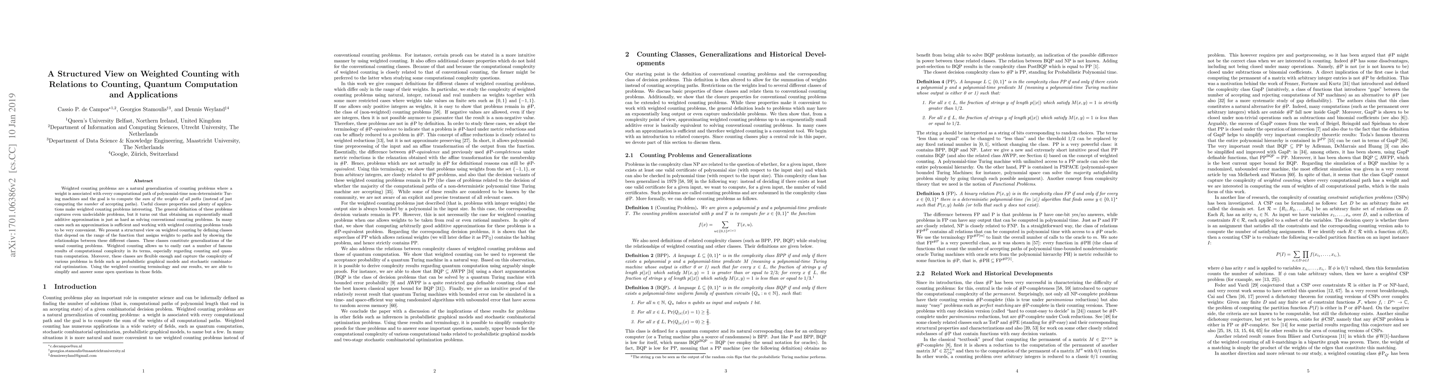 Weighted counting problems are a natural generalization of counting problems where a weight is associated with every computational path of polynomial-time non-deterministic Turing machines and the goal is to compute the sum of the weights of all paths (instead of just computing the number of accepting paths). Useful closure properties and plenty of applications make weighted counting problems interesting. The general definition of these problems captures even undecidable problems, but it turns out that obtaining an exponentially small additive approximation is just as hard as solving conventional counting problems. In many cases such an approximation is sufficient and working with weighted counting problems tends to be very convenient. We present a structured view on weighted counting by defining classes that depend on the range of the function that assigns weights to paths and by showing the relationships between these different classes. These classes constitute generalizations of the usual counting problems. Weighted counting allows us to easily cast a number of famous results of computational complexity in its terms, especially regarding counting and quantum computation. Moreover, these classes are flexible enough and capture the complexity of various problems in fields such as probabilistic graphical models and stochastic combinatorial optimization. Using the weighted counting terminology and our results, we are able to simplify and answer some open questions in those fields.