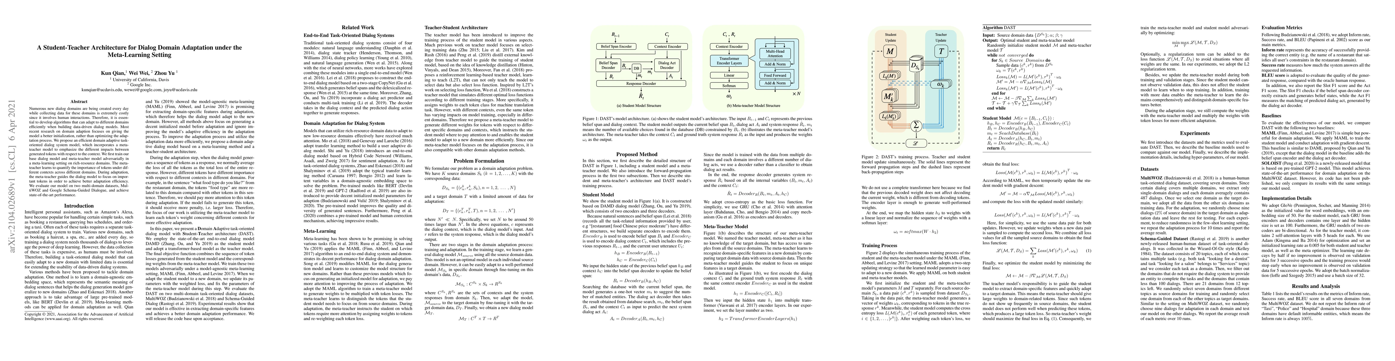 This paper proposes a student-teacher architecture for dialog domain adaptation using meta-learning, where a meta-teacher model guides the student dialog model to focus on important tokens for efficient adaptation across domains. The approach achieves state-of-the-art performance on MultiWOZ and Google Schema-Guided Dialogue datasets.