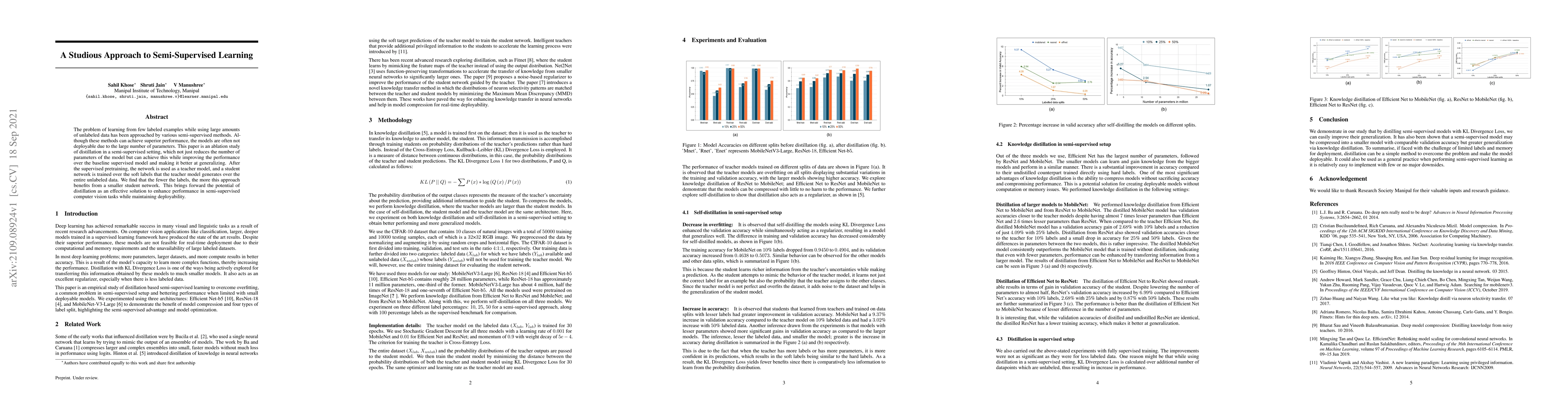 The problem of learning from few labeled examples while using large amounts of unlabeled data has been approached by various semi-supervised methods. Although these methods can achieve superior performance, the models are often not deployable due to the large number of parameters. This paper is an ablation study of distillation in a semi-supervised setting, which not just reduces the number of parameters of the model but can achieve this while improving the performance over the baseline supervised model and making it better at generalizing. After the supervised pretraining, the network is used as a teacher model, and a student network is trained over the soft labels that the teacher model generates over the entire unlabeled data. We find that the fewer the labels, the more this approach benefits from a smaller student network. This brings forward the potential of distillation as an effective solution to enhance performance in semi-supervised computer vision tasks while maintaining deployability.
