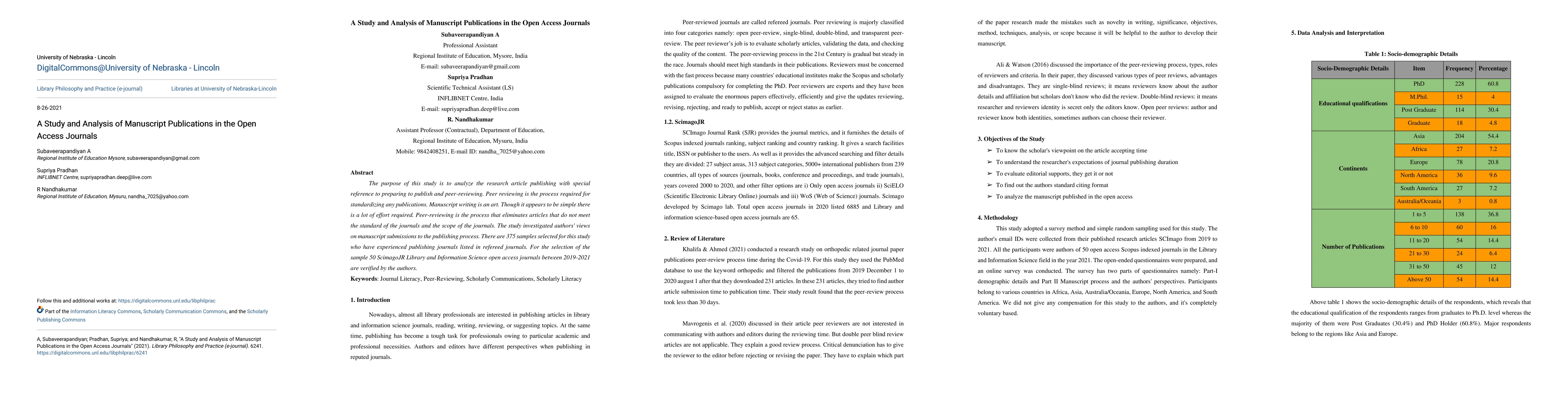 This study analyzes the manuscript publication process in open access journals, focusing on author experiences with manuscript preparation and peer review. It surveyed 375 authors who published in 50 selected open access journals between 2019 and 2021, emphasizing the importance of peer review in maintaining publication standards.
