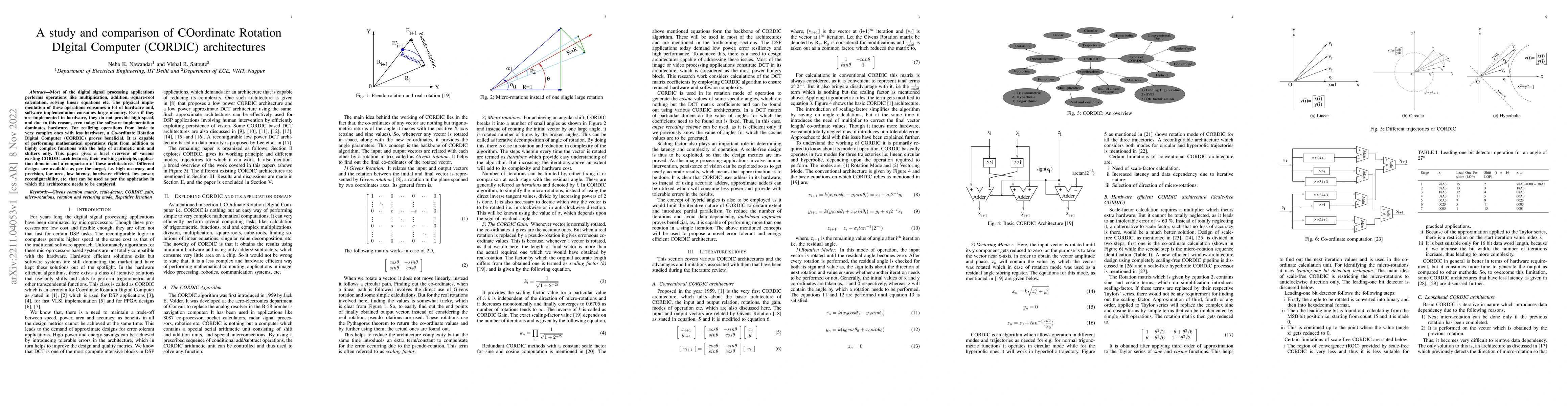 This paper provides an overview of various CORDIC architectures, comparing their working principles, applications, and designs tailored for high accuracy, low area, low latency, hardware efficiency, low power, and reconfigurability to suit different digital signal processing needs.