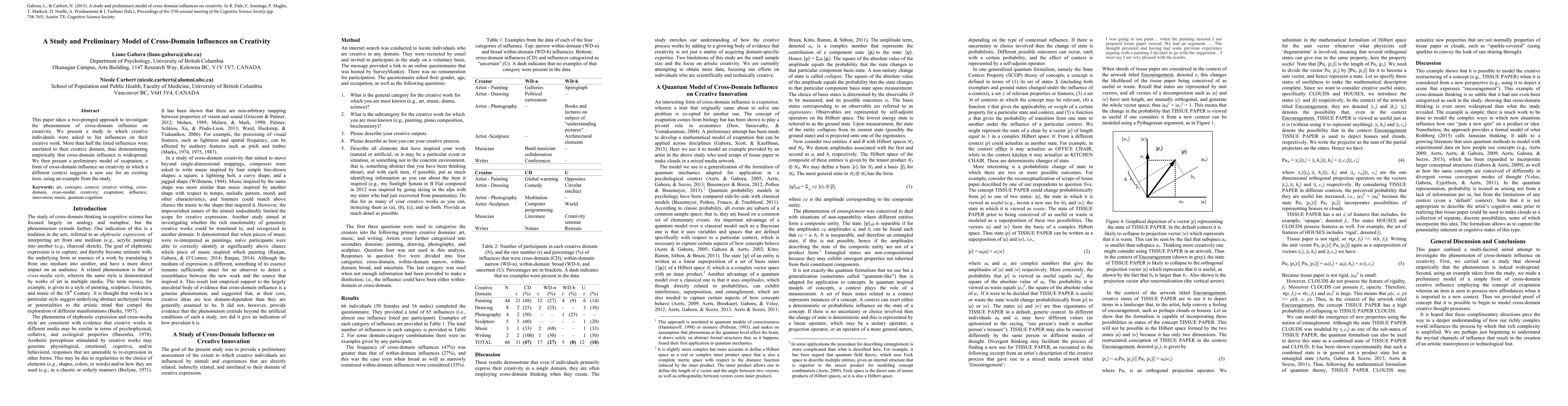 Research shows that cross-domain influence on creativity is widespread, with over half of creative individuals citing influences from unrelated domains. A preliminary model of exaptation suggests a new use for existing items in different contexts.