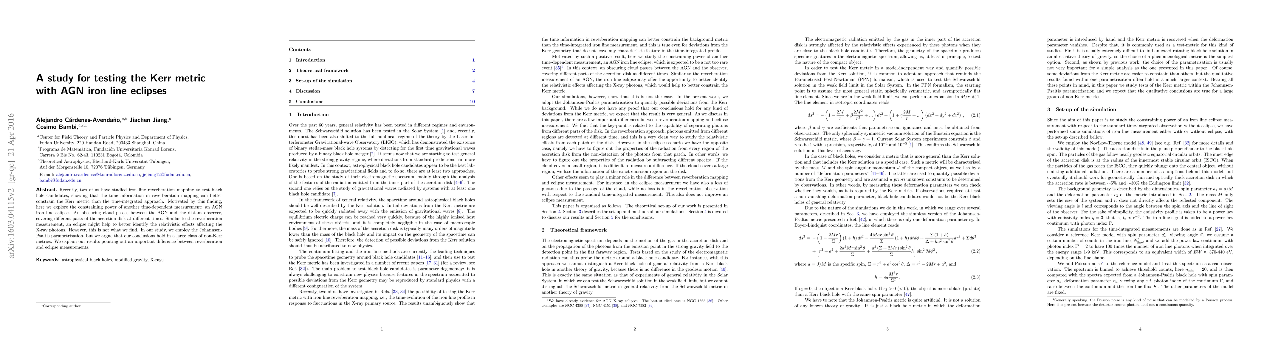 This study investigates the Kerr metric using AGN iron line eclipses, finding that unlike reverberation mapping, eclipses do not significantly constrain the metric. The authors employ the Johannsen-Psaltis parametrisation and argue that their conclusions apply broadly beyond just non-Kerr metrics.