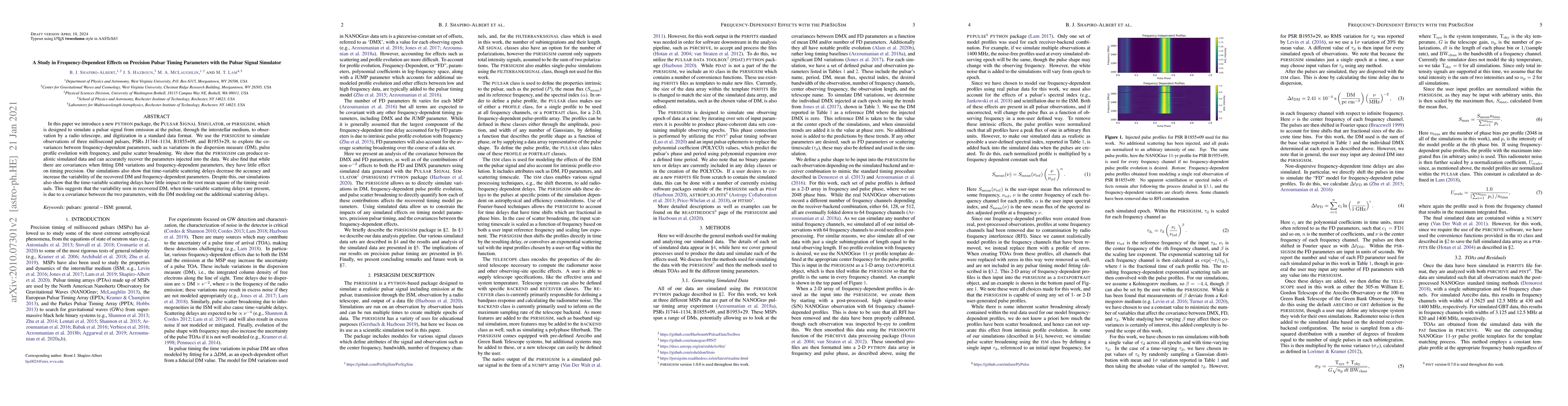 This paper introduces the Pulsar Signal Simulator (PsrSigSim) to simulate pulsar signals from emission to observation, and uses it to explore frequency-dependent parameters in three millisecond pulsars. The study finds that while there are covariances between these parameters, they have minimal effect on timing precision, though time-variable scattering delays reduce parameter accuracy.
