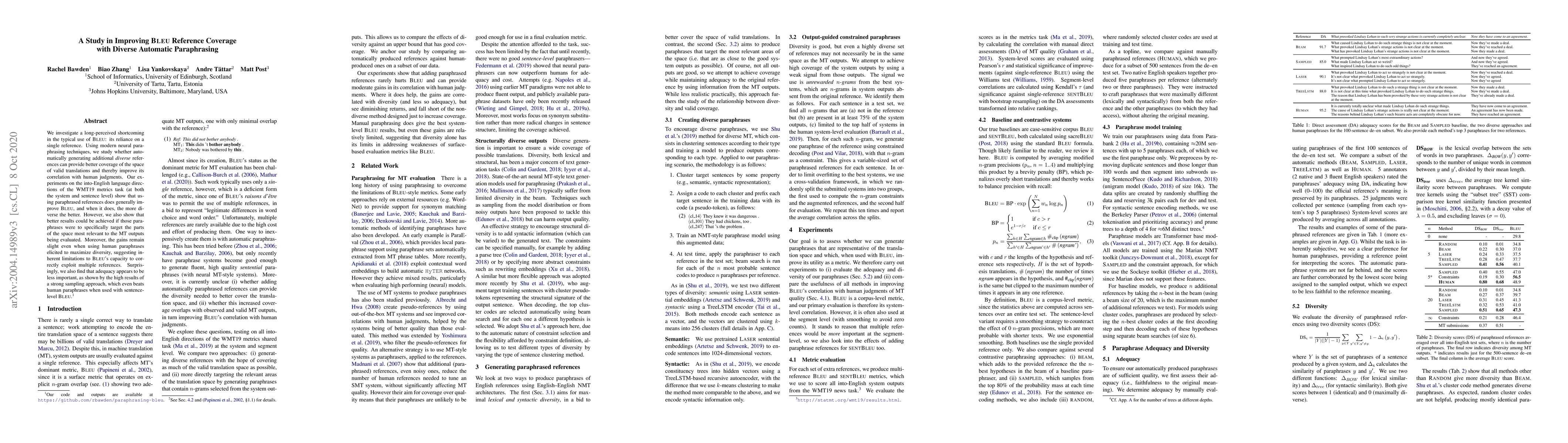 We investigate a long-perceived shortcoming in the typical use of BLEU: its reliance on a single reference. Using modern neural paraphrasing techniques, we study whether automatically generating additional diverse references can provide better coverage of the space of valid translations and thereby improve its correlation with human judgments. Our experiments on the into-English language directions of the WMT19 metrics task (at both the system and sentence level) show that using paraphrased references does generally improve BLEU, and when it does, the more diverse the better. However, we also show that better results could be achieved if those paraphrases were to specifically target the parts of the space most relevant to the MT outputs being evaluated. Moreover, the gains remain slight even when human paraphrases are used, suggesting inherent limitations to BLEU's capacity to correctly exploit multiple references. Surprisingly, we also find that adequacy appears to be less important, as shown by the high results of a strong sampling approach, which even beats human paraphrases when used with sentence-level BLEU.