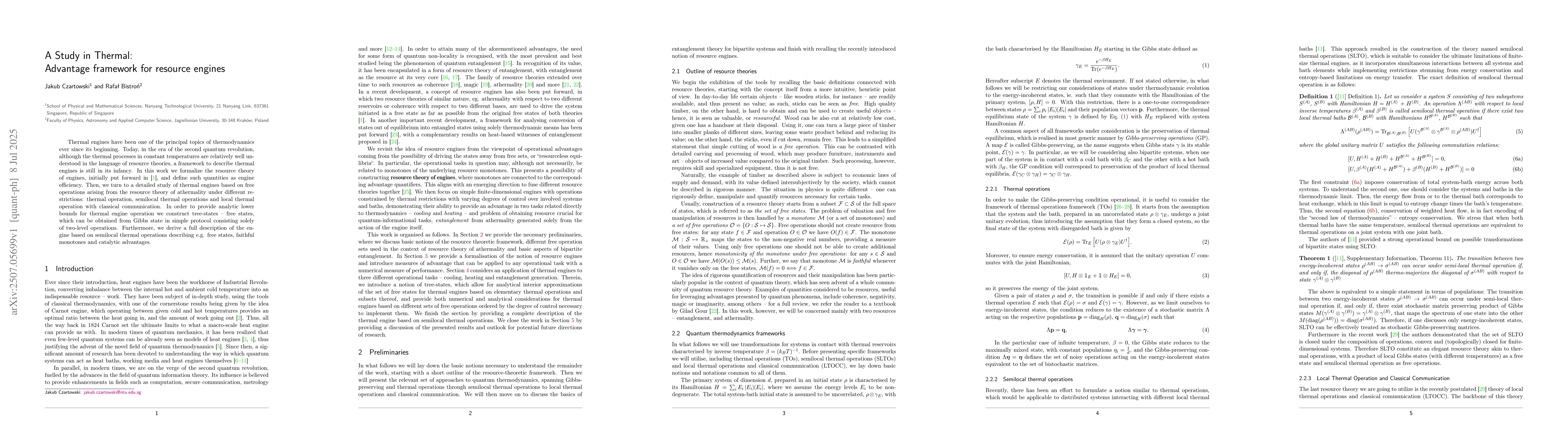 Thermal engines have been one of the principal topics of thermodynamics ever since its beginning. Today, in the era of the second quantum revolution, although the thermal processes in constant temperatures are relatively well understood in the language of resource theories, a framework to describe thermal engines is still in its infancy. In this work we formalize the resource theory of engines, initially put forward in [Quantum 8, 1222], and define such quantities as engine efficiency. Then, we turn to a detailed study of thermal engines based on free operations arising from the resource theory of athermality under different restrictions: thermal operation, semilocal thermal operations and local thermal operation with classical communication. In order to provide analytic lower bounds for thermal engine operation we construct tree-states -- free states, which can be obtained from Gibbs state in simple protocol consisting solely of two-level operations. Furthermore, we derive a full description of the engine based on semilocal thermal operations describing e.g. free states, faithful monotones and catalytic advantages.